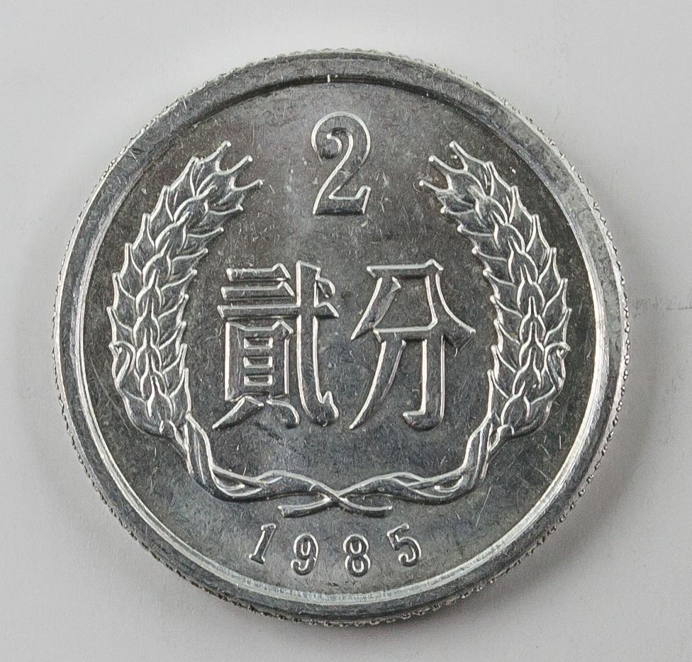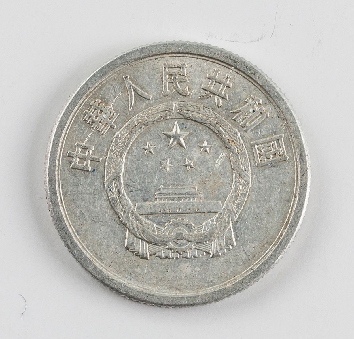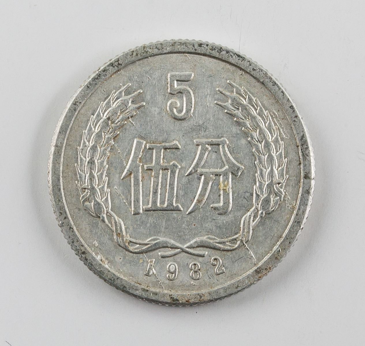 4 assorted Chinese aluminum coins; of 3 Five Cents coins (1982, 1984, 1990), KM-3; of 1 1985 Two Cents coin, KM-2; obverse engraved wreath, lettering year and value; reverse engraved national emblem; reeded edge; Diameter: 23.96 mm - 20.99 mm, 5.978 grams