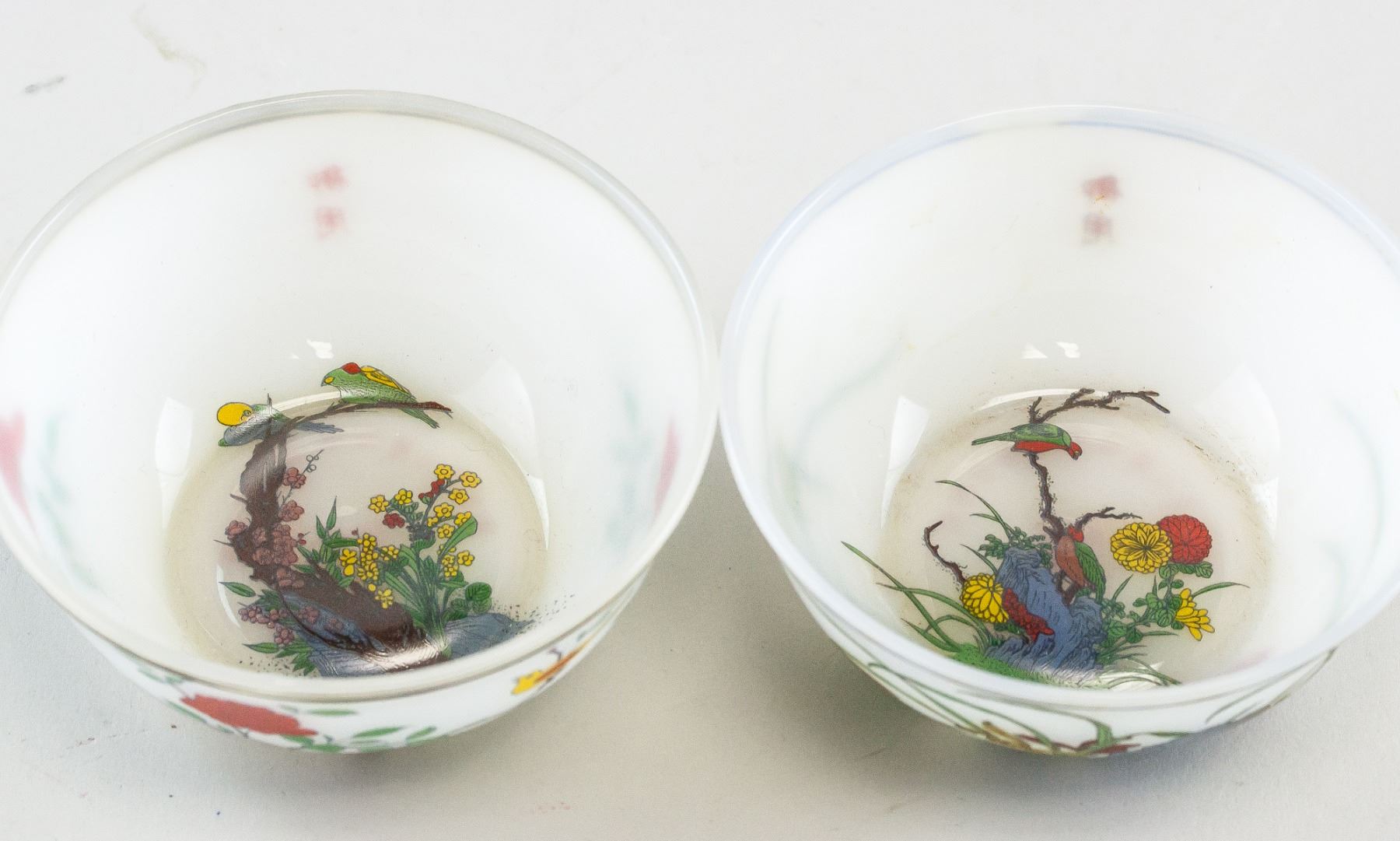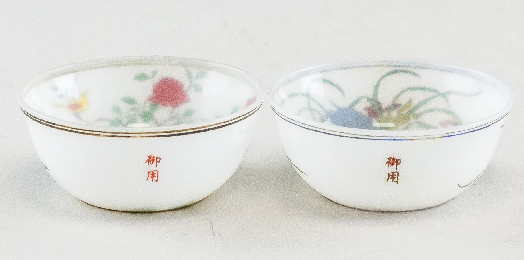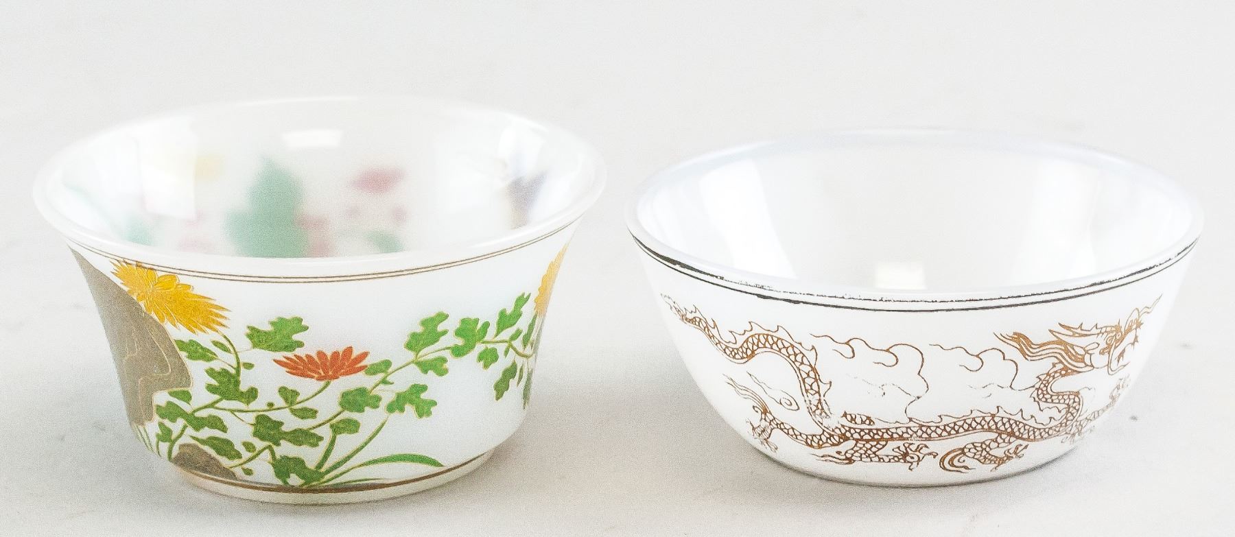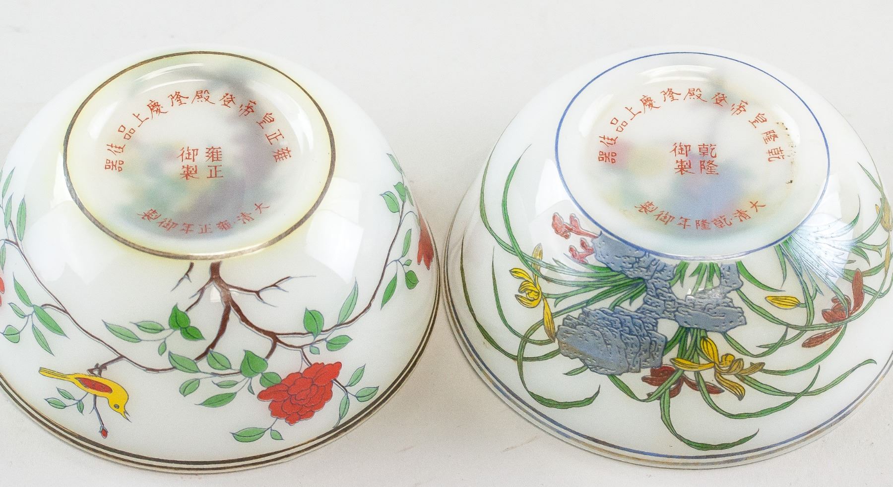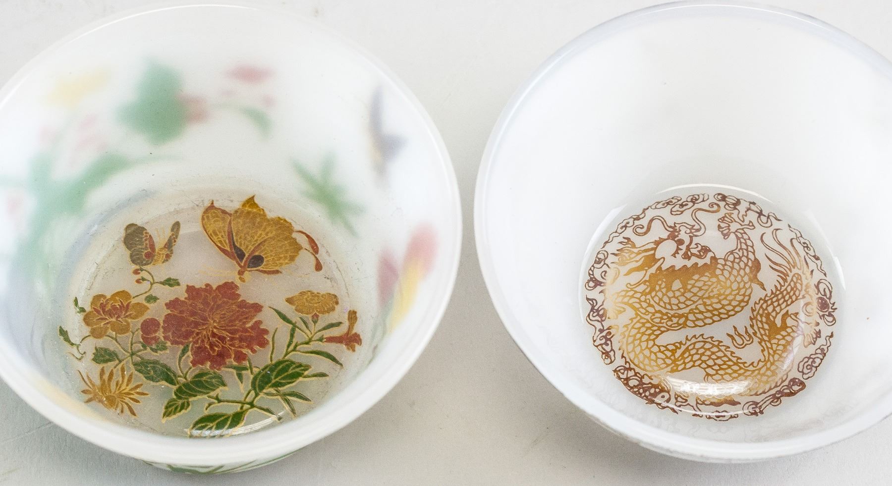 Four (4) assorted Chinese porcelain cups. Of round edge, tapering to bottom. Painted with flower, birds, and dragon. Three of them with Qing-dynasty Qianlong mark. one with six-character Ming dynasty Chenghua mark. 4.5 x 8.5 cm ~ 5 x 8 cm, 171 grams total