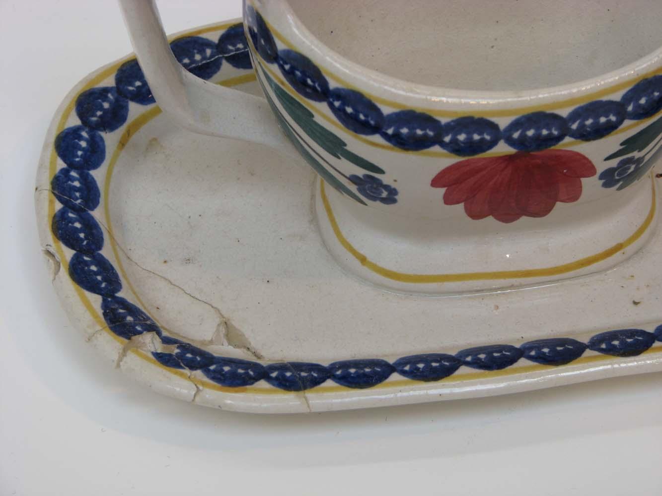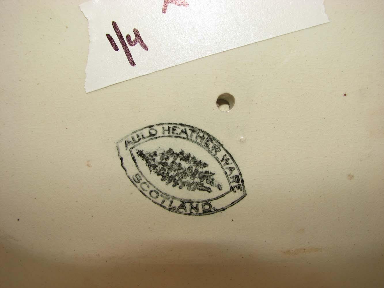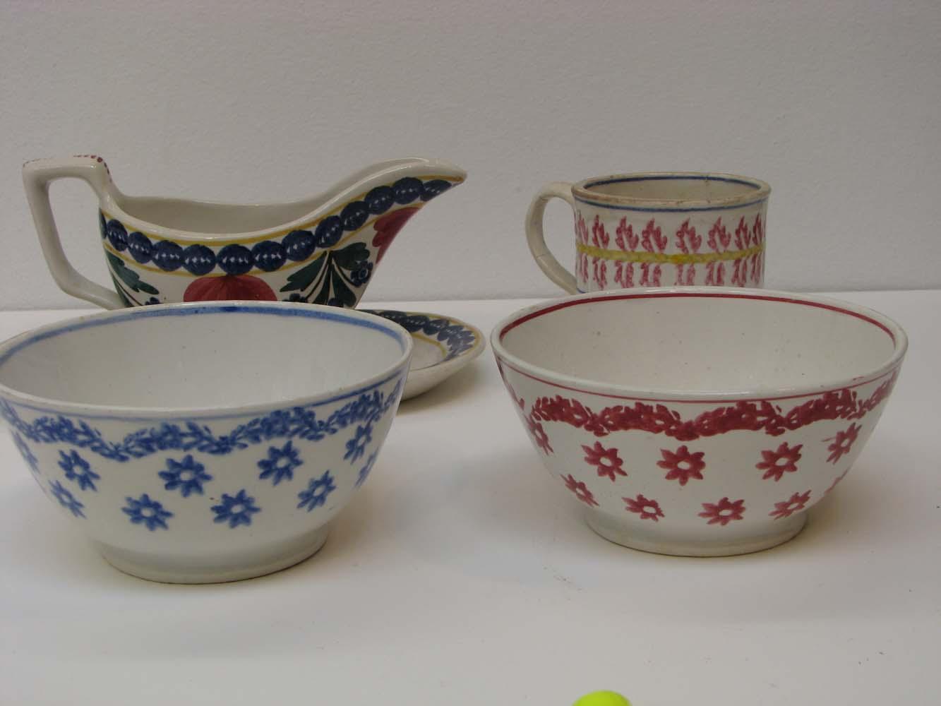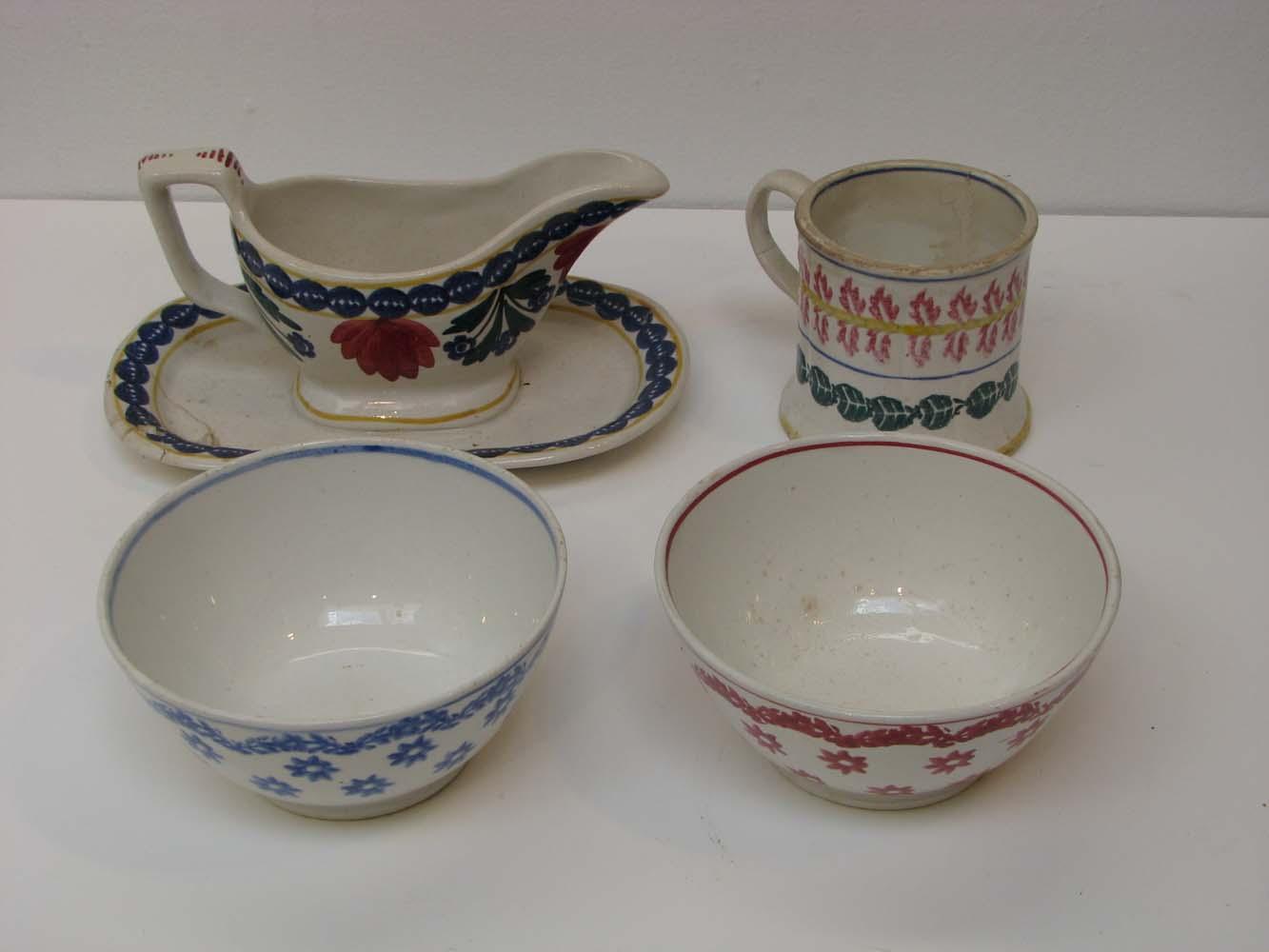 Title: 4 Assorted Stick Spatter ceramics including: 2 English bowls, 1 mug, 1 gravy boat with undertray (Auld Heatherware Scotland, damaged, old repairs and chips)