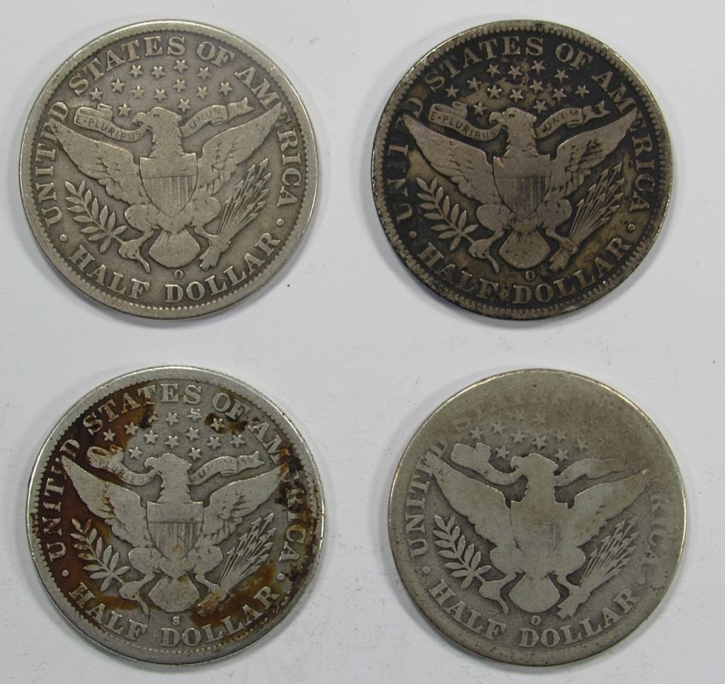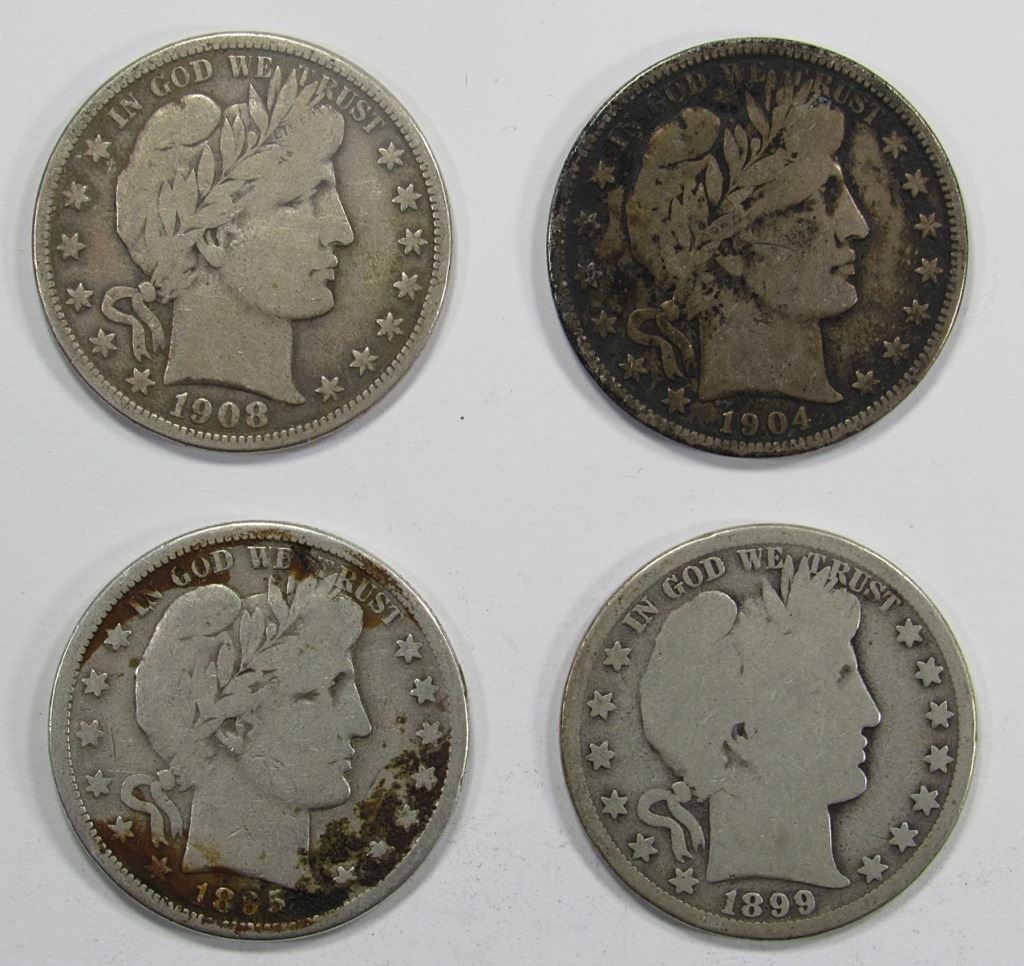 4- BARBER HALF DOLLARS: 1895-S, 1899-O, 1904-O, 19