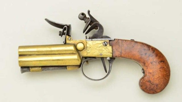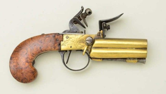 4 BBL tap-action flintlock pistol with all brass construction and birds eye maple stock possibly American. This pocket size flint is 40 plus caliber and remains in very good condition. No proofs. Nice wood also verygood to near fine. Last sold by Richard K. Bourne in the James Elwood Jones collection. From a New York collectors estate. Est.:$1,000-$2,000.