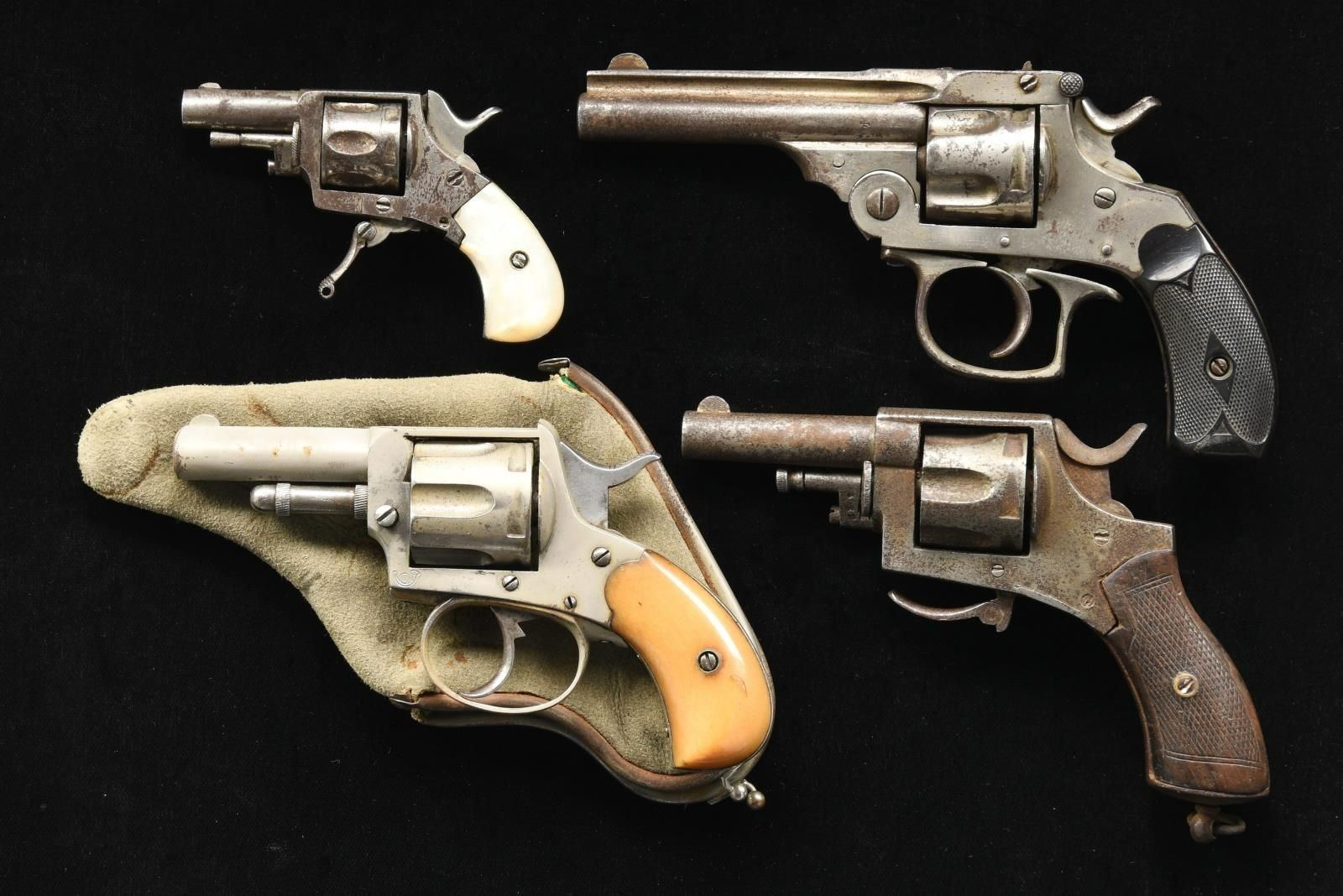 1) BELGIAN FOLDING TRIGGER DA REVOLVER. Cal. 22 RF. NSN. Bbl. 1 3/8". Round blade front sight. Right side of frame marked "BELGIUM" & w/ "(Crown)/R" proof. Rear of cyl. marked w/ circled "E LG" Liege proof. Nickel finish. Action is stiff when hand cycled. Pearl style grips. CONDITION: grips show a few light chips & some handling wear. Metal shows scattered flaking, oxidation & some pitting. Oxidized bore. (23-5603/MJC). CURIO. $50-100. 2) BELGIAN PHEONIX REVOLVER. Cal. 32 CF. S# 113. Bbl. 2 1/4". Round blade front sight. Fixed rear sight. Matte nickel finish. Belgian proofed revolver w/ crown "L" on front of frame & circled "E LG" proof on rear of cyl. Topstrap marked "PHOENIX". Smooth plastic grips. UNATTACHED ACCESSORIES: unmarked carrying pouch. CONDITION: left grip panel shows a small crack beneath screw hole. Grips otherwise show some dings & handling marks. Metal has a dull cleaned appearance w/ scattered oxidation & some pitting. Pitted bore. (23-5677/MJC). CURIO. $40-60. 3) 23-5679 BELGIAN DA TOP BREAK REVOLVER. Cal. 32 S&W. NSN. Bbl. 3 1/2". Round blade front sight. U-notch rear sight. Nickel plated finish. Left side of bbl. & rear of cyl. have "(Star) T" Belgian proofs. Rear of cyl. also has circled "E LG" proof. Extractor assembly, rear trigger guard screw & possibly other parts are missing. Double action not working properly & single action is sluggish when hand cycled. Checkered black hard rubber grips. CODNITION: grips show light dings & handling wear. Metal shows scattered flaking, oxidation & pitting. Pitted bore. (23-5603/MJC). CURIO. $40-60. 4) 23-5708 BELGIAN FOLDING TRIGGER REVOLVER. Cal. 7.65mm. S# 682. Bbl. 2 1/2". Round blade front sight. Ejector rod assembly numbered "682". Left side of frame has crown "FR" proof. No other visible markings. Loading gate is loose. Hammer will not cock cyl. & some parts maybe missing. Checkered hardwood grips. Bottom of grip frame has lanyard w/ lanyard ring. CONDITION: grip screw exhibits notable slot damage & will not turn. Grips show heavy handling wear w/ chips, dings & handling marks. Metal is a gray oxidized patina w/ scattered notable pitting. Pitted bore w/ heavily worn rifling. (23-5708/MJC). CURIO. $30-50.