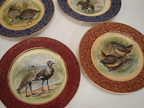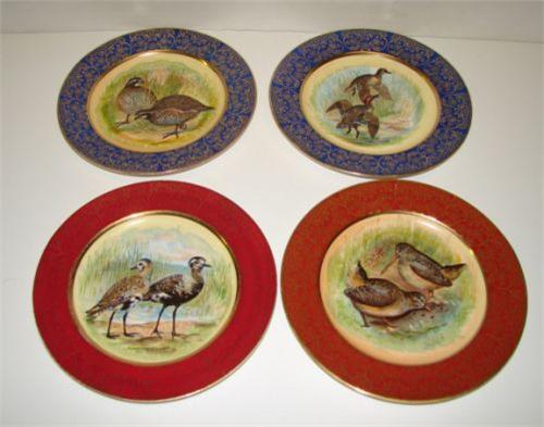 4 BIRD & WATERFOWL DECORATED PLATES. Two plates have red borders with floral gilt decoration and two plates have blue borders with floral gilt decoration. All scenes are different with artist signatures. No mark. 8.25" Dia.