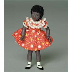 Lot 398: 4" BLACK GIRL "CANDY" BY EUNICE TUTTLE. Jointed all bisque artist doll of a young black girl in her original box her outfit matches "Chet's"). CONDITION: Very fine. 1-1239-2 JL288