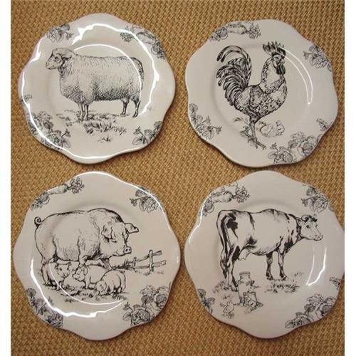 <tr><td>Title:4 BLACK TRANSFER BARNYARD TOILE 12" PLATES</td></tr>