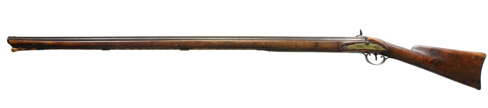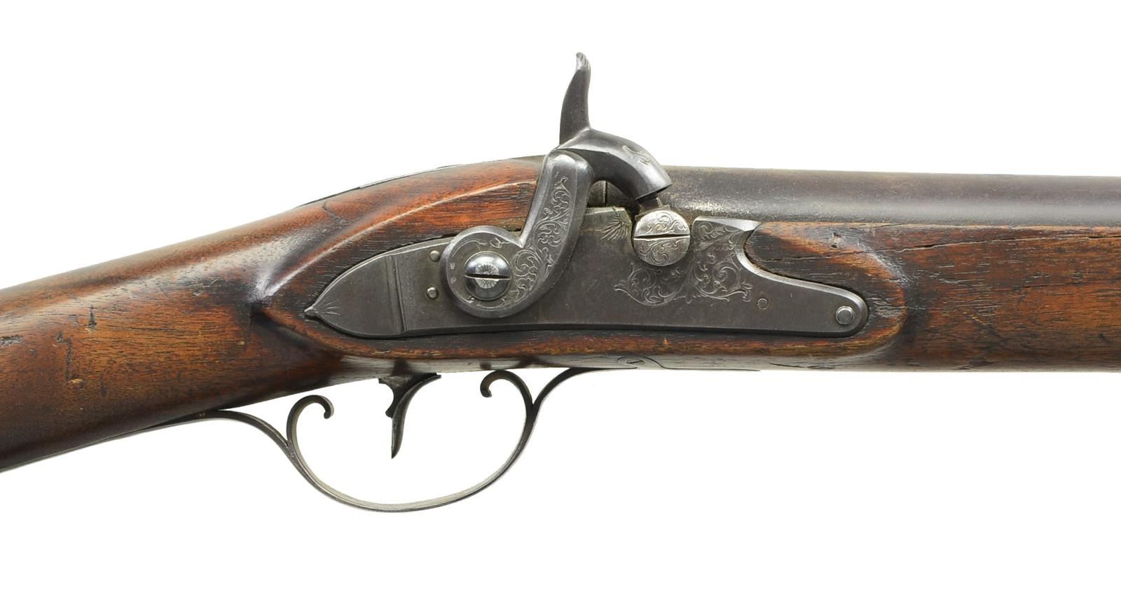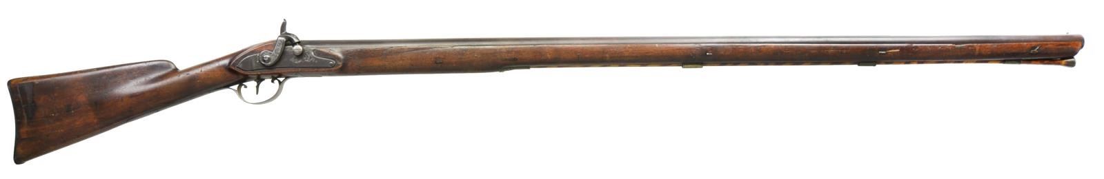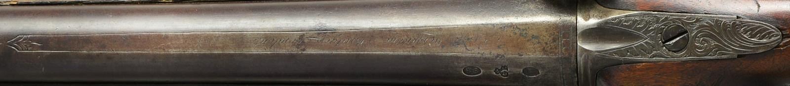 FOWLER. Cal. 4 Bore (.950"). NSN. Bbl. 53 7/8" w/ London proofs. Bolster & nipples conversion. Top flat has address of "Hermitage Bridge London". Muzzle has has German silver 4 pointed star inlay w/ front sight. Conversion lock & hammer have highlights of vine type foliate scroll engraving that continue to top tang & trigger guard. Breech end of bbl. has teardrop engraving leading to banner w/ address. Engraved brass sideplate. Bolt fastened full length walnut stock fastened by 4 bolts. LOP: 16 1/2" to steel shotgun butt. Artificially stripped horn tipped ramrod held by brass thimble & 3 pipes. Rear pipe is a replacement. Weight: 16 Lbs., 15 oz. CONDITION: metal finish has faded to mottled brown w/ some pitting in breech area. Stock has worn appearance w/ dents & handling marks. Sm. chips around tang & sideplate. Lg. repaired cracks in forearm area. Hammer will not fully drop when trigger is pulled. Dark lightly pitting bore. (01-18087/DS). ANTIQUE. $1,350-2,000.
