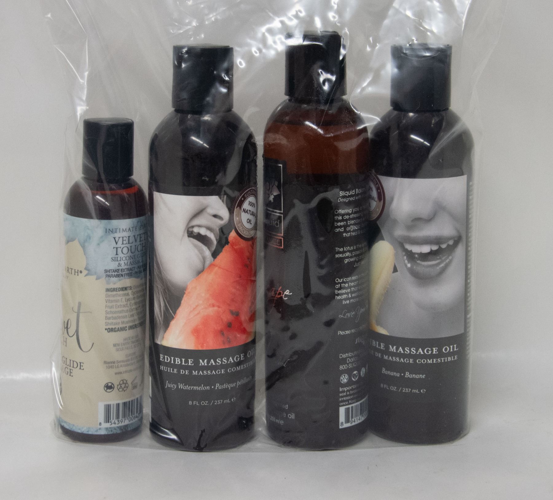 4 BOTTLES OF MASSAGE OIL - 3 BOTTLES ARE EDIBLE