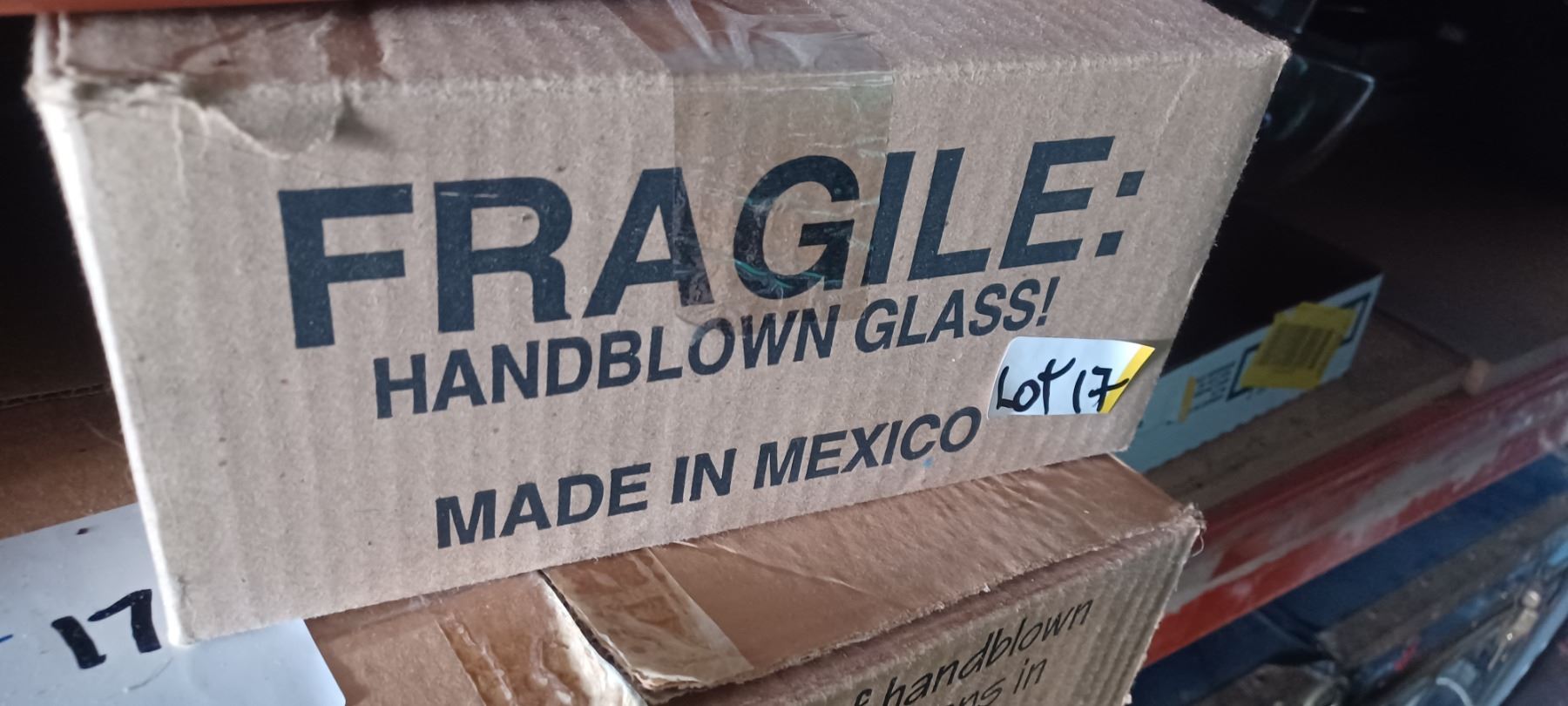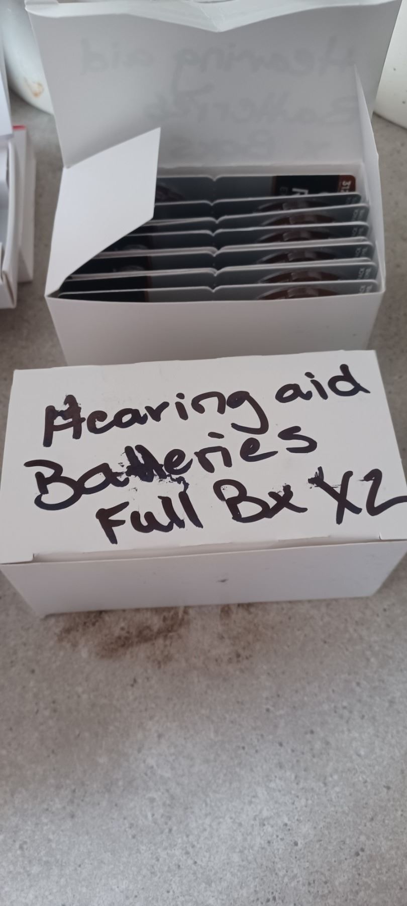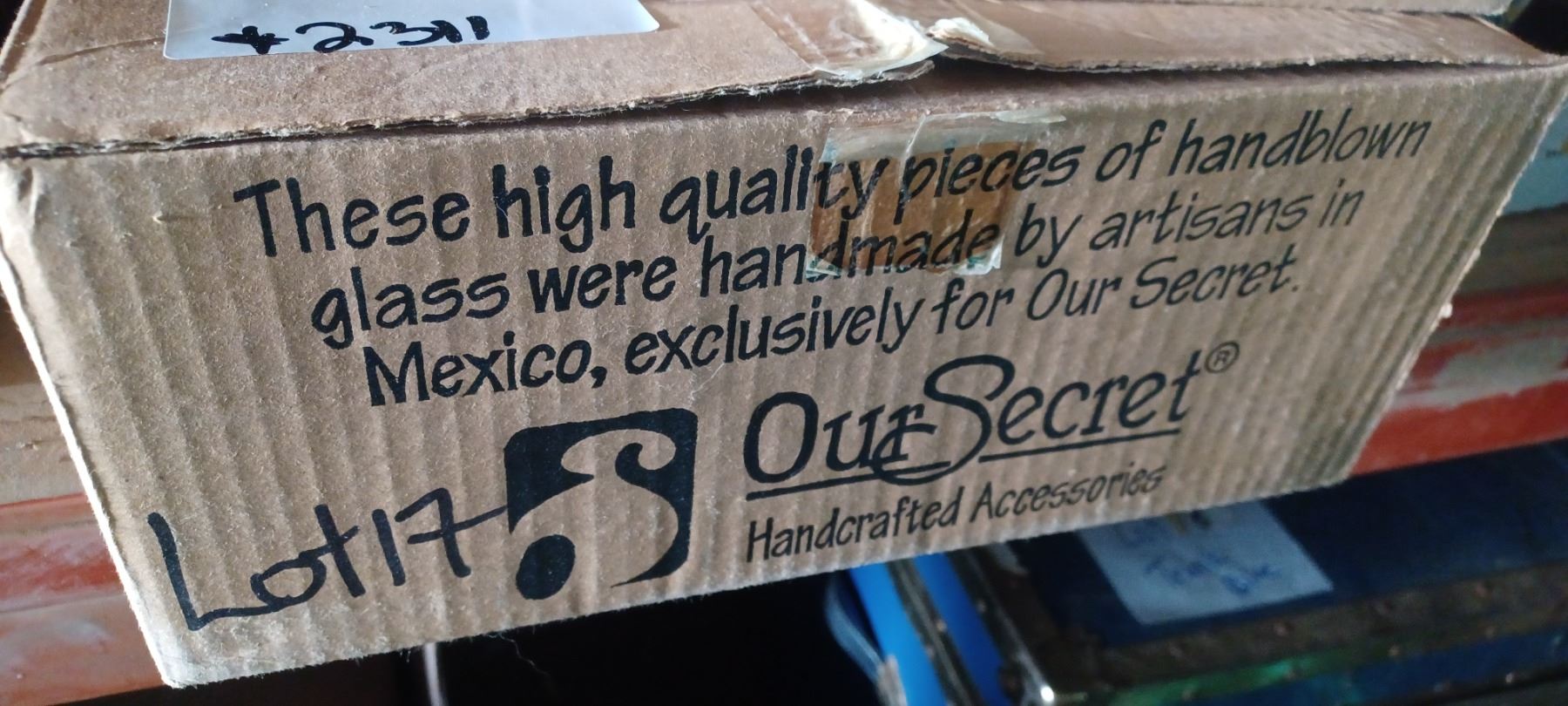 4 BOXES OF BLOWN GLASSWARE, DISHWARE AND RAYVAC HEARING AID BATTERIES