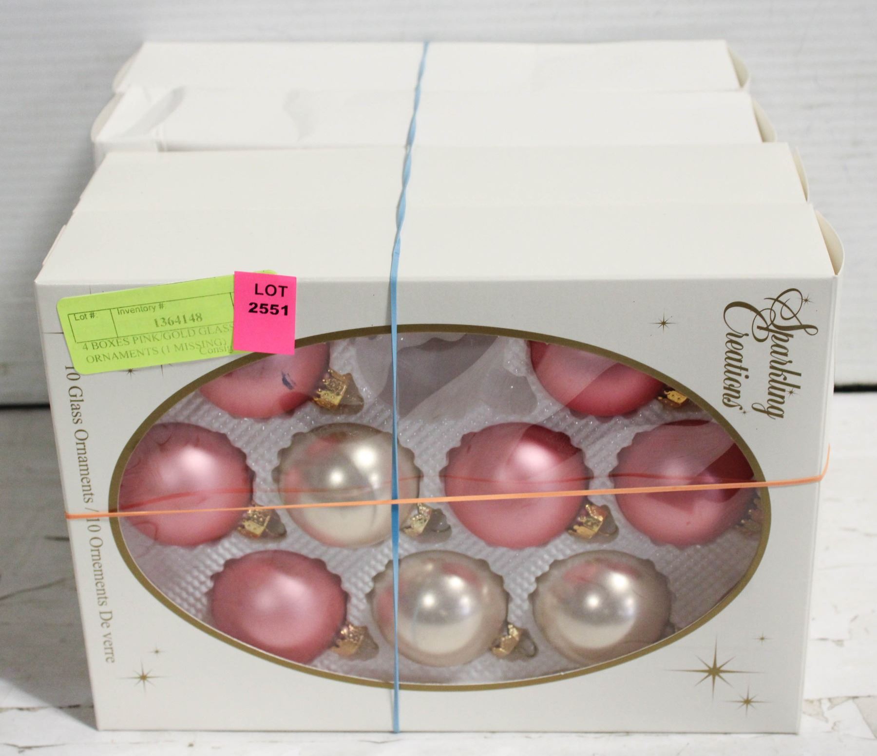 4 BOXES PINK/GOLD GLASS ORNAMENTS (1 MISSING)