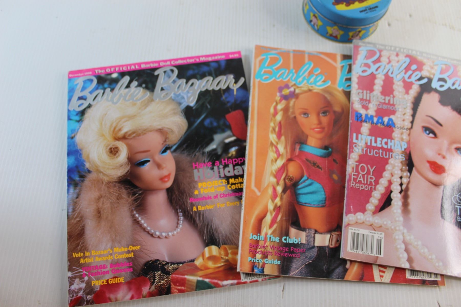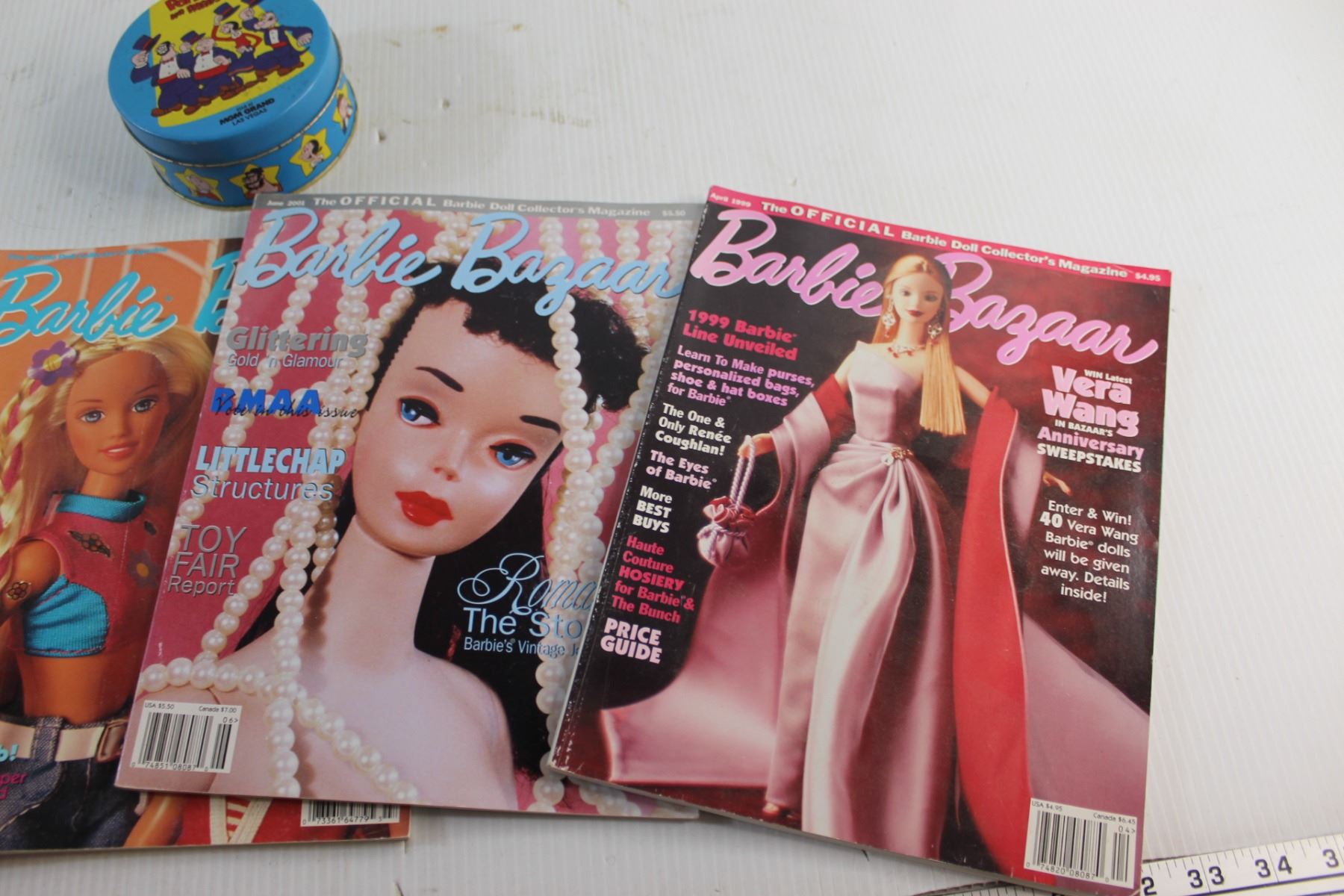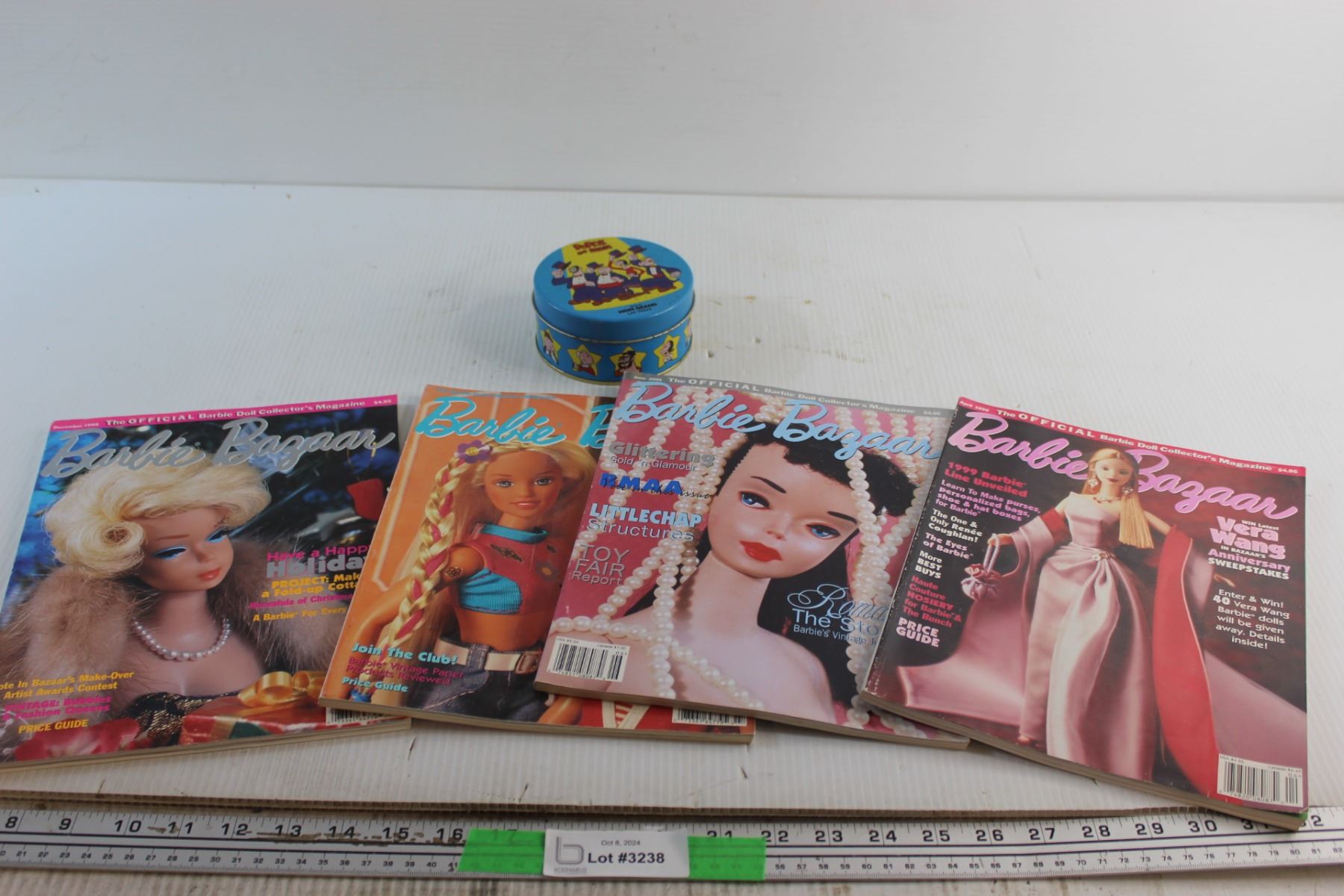 (4) Barbie Bazaar Magazines (July/Aug 97, Dec 98, April 99, June 01) - and Popeye and Friends Tin