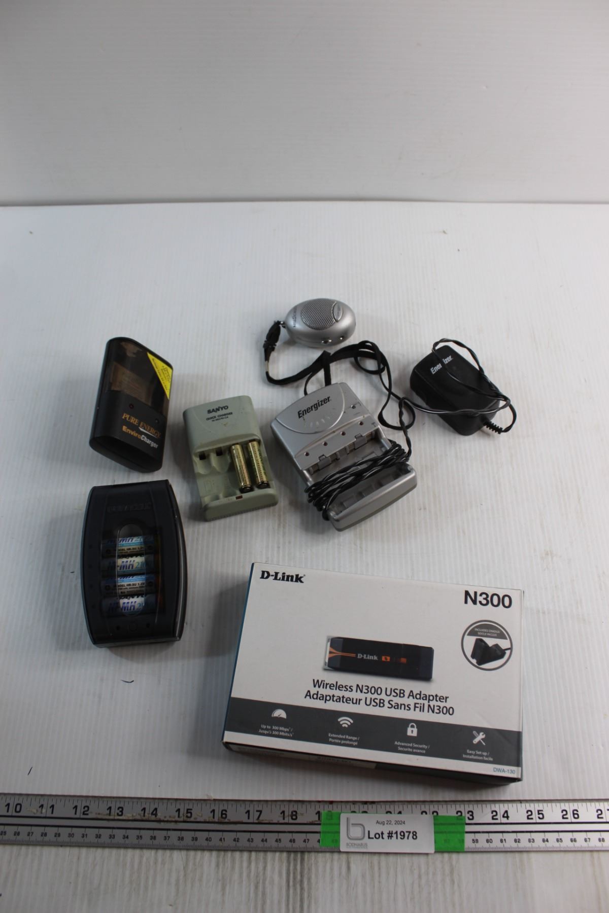 (4) Battery Chargers and D Link Wireless N300 USB Adapter - Untested
