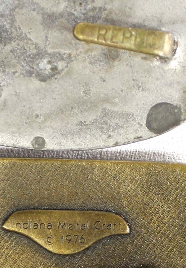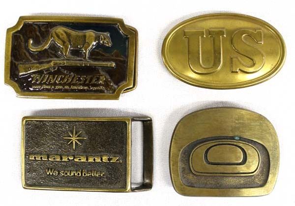 4 Belt Buckles, includes: A. 1976 Indiana Metal Craft Winchester Buckle B. Brass Buckle C. Brass Marantz Buckle D. Replica US Cavalry Buckle largest measures 3.75'' x 2.25''
