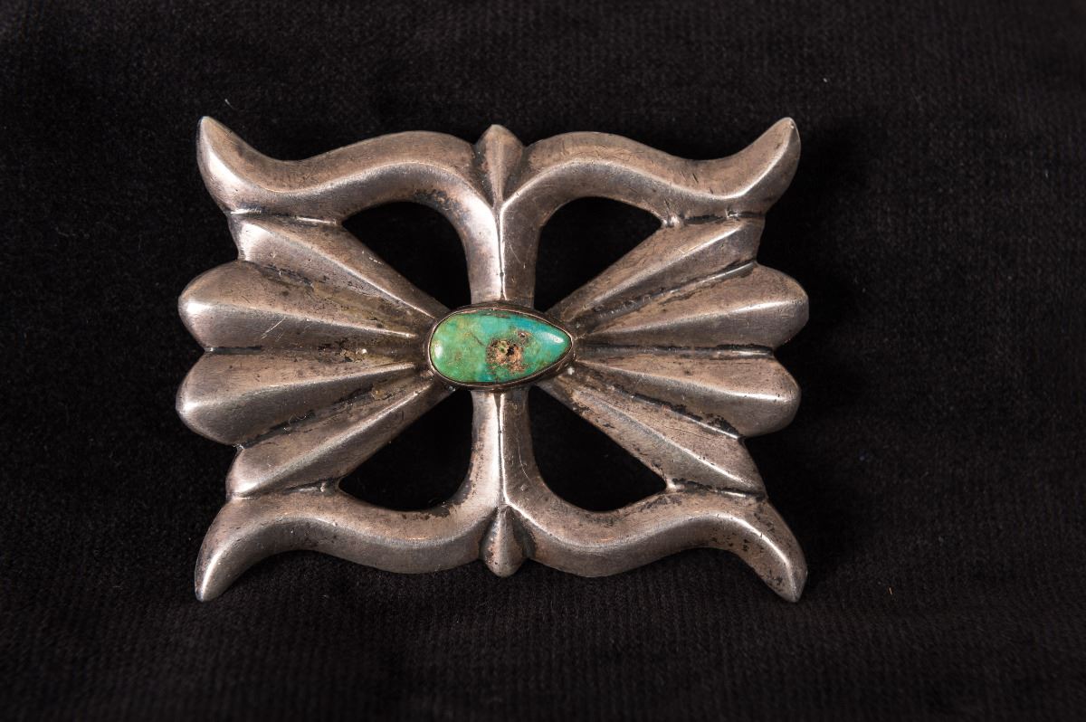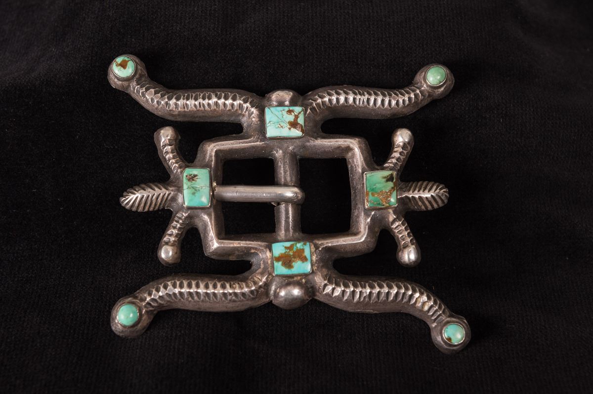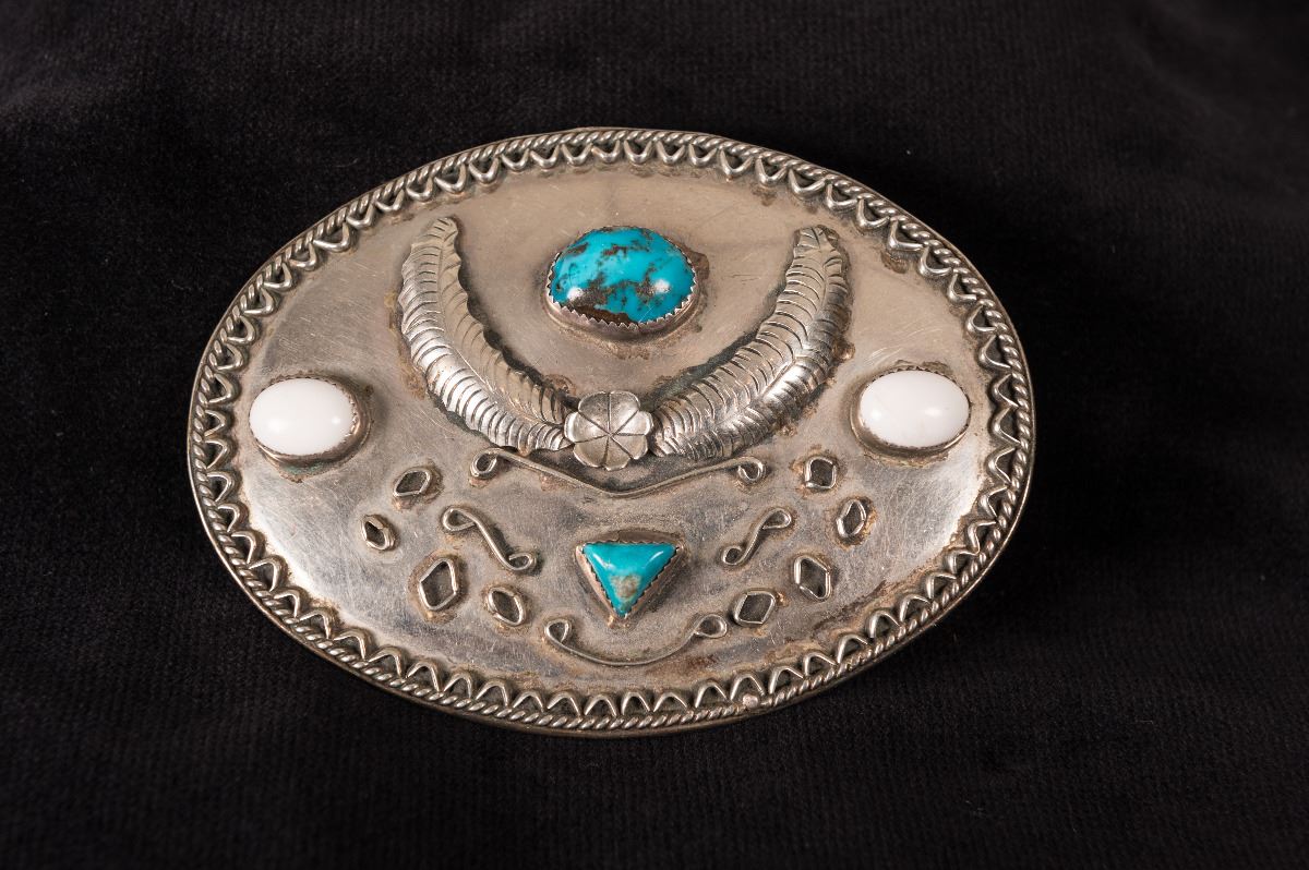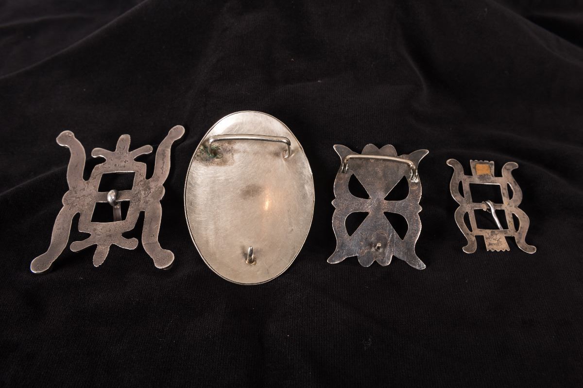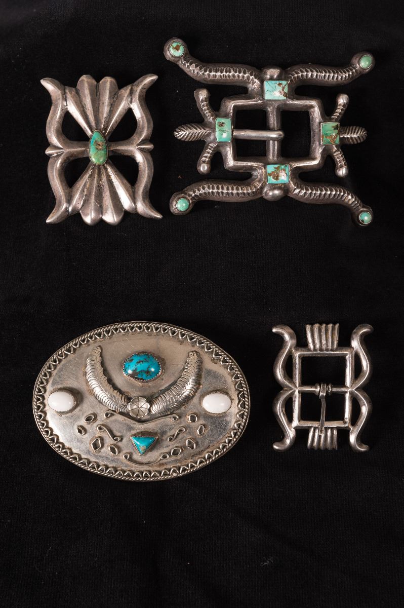 4 Belt buckles. Three Sand cast buckles, one made from sheet silver. Three are inlaid with beautiful turquoise.