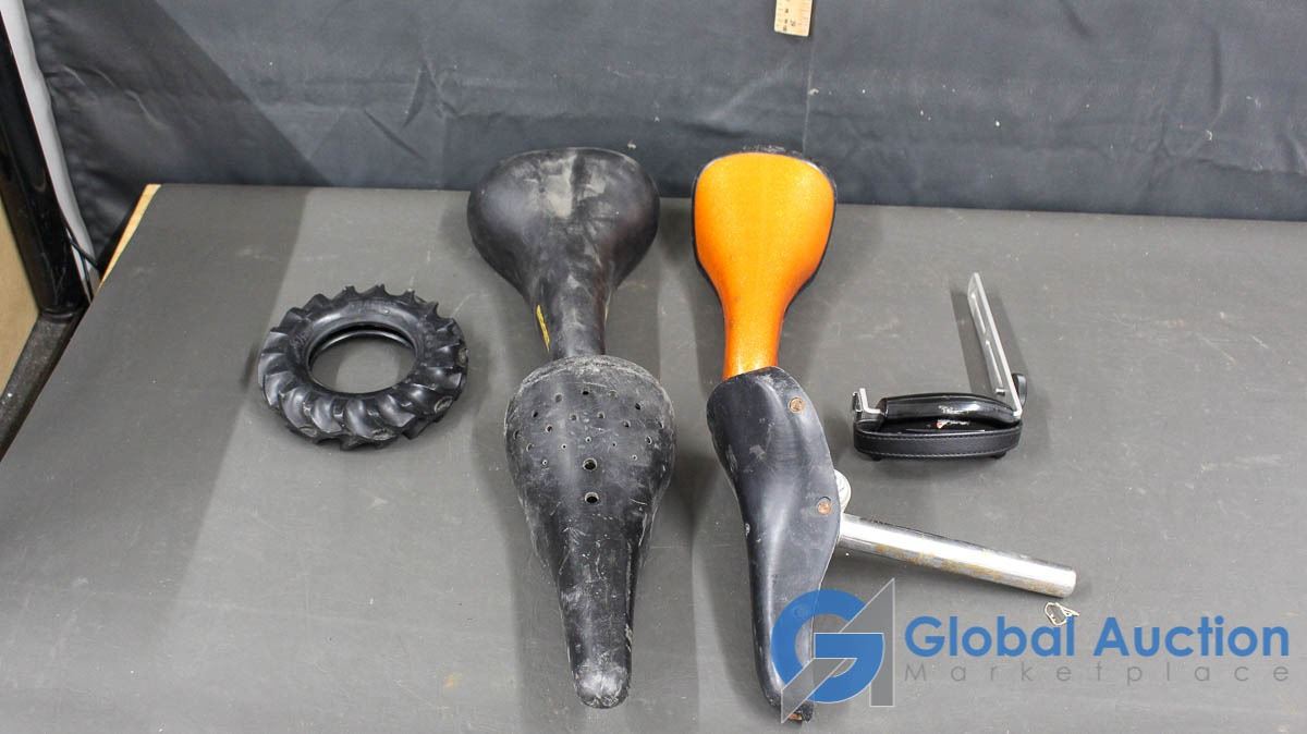4 Bicycle Seats, Firestone Advertising Tire, and Camera Holder