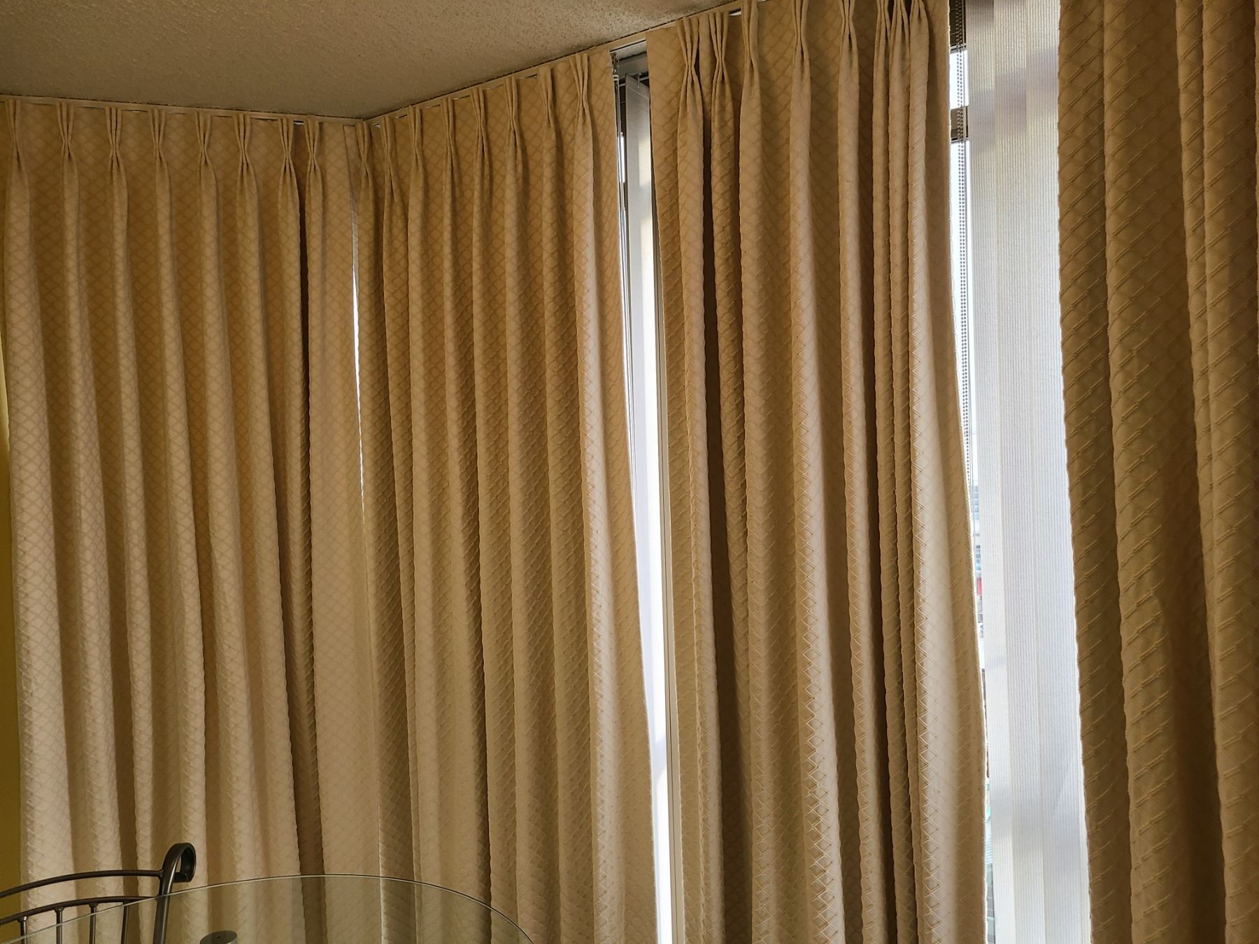Ivory with diamond pattern. Each panel is 74 inches wide by 84” length. Curtains have been taken down off the rails, just bring bags. Pickup at 11 am