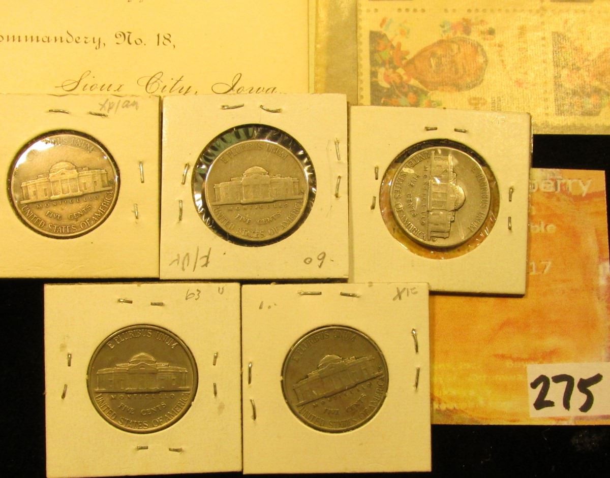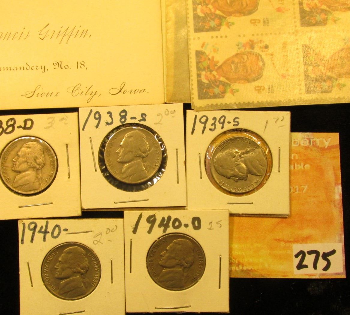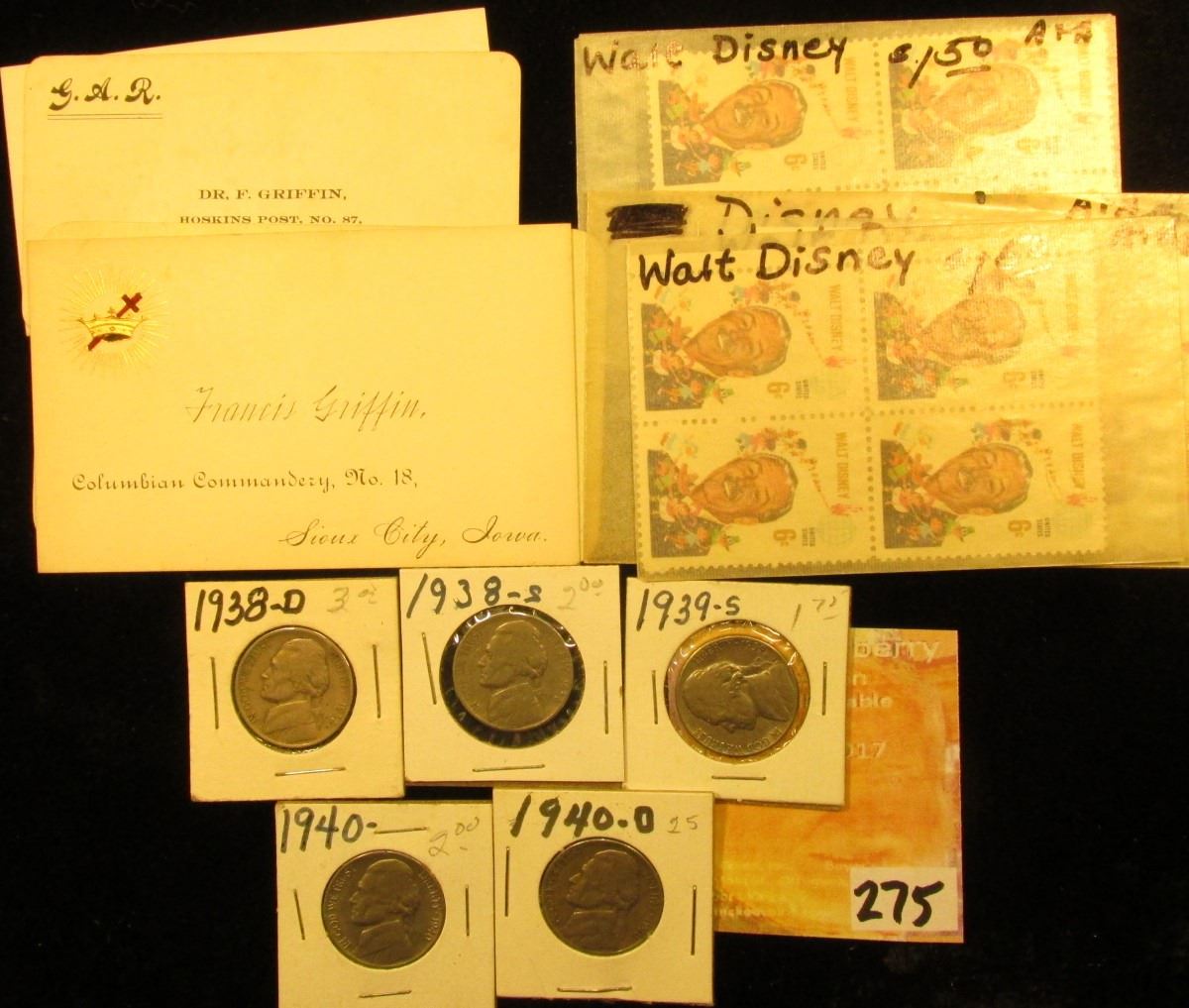 (4) Blocks of Four Walt Disney Six Cent U.S.A. Stamps; several business cards from Mr. Griffin, Sioux City & Mapleton, Iowa; 1938 D, S, 39 S, 40 P, & D Jefferson Nickels with grades up to AU.