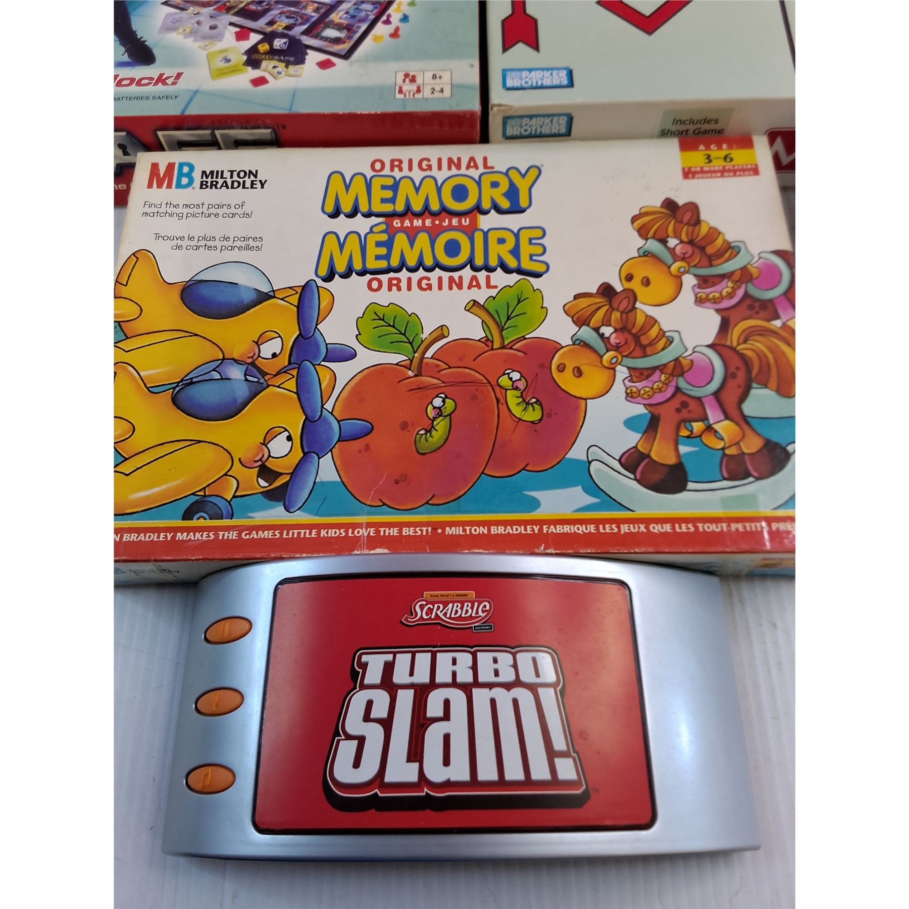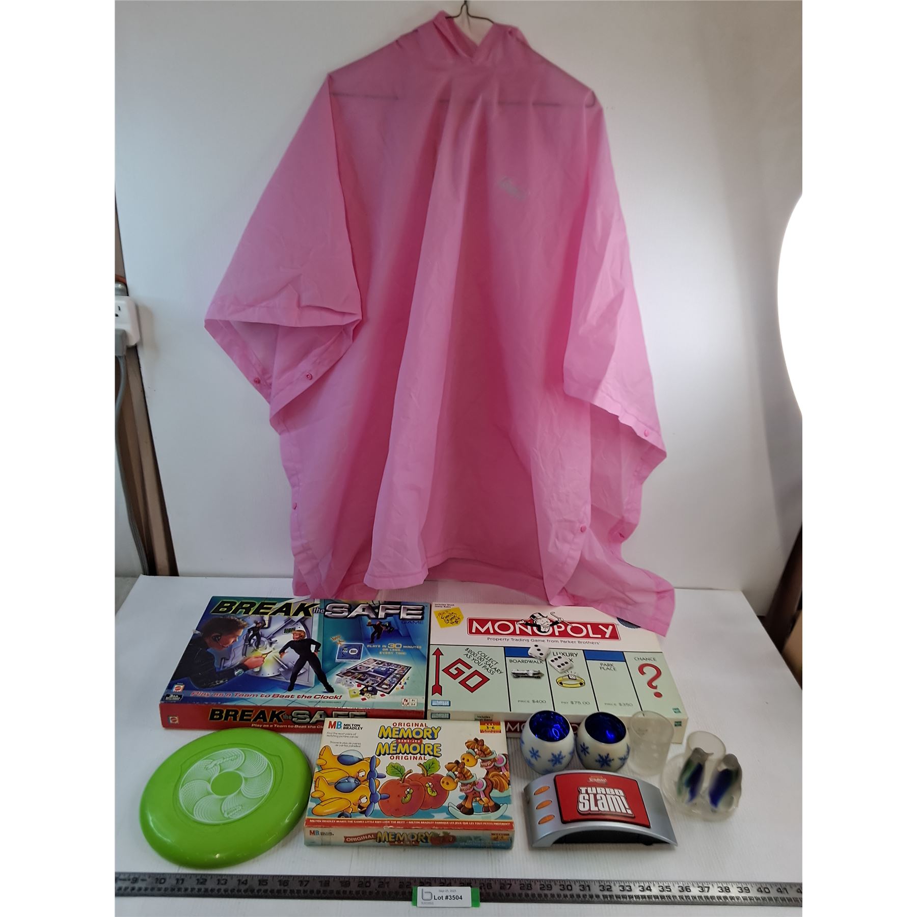(4) Board Games (Monopoly, Memory, Scrabble), Ornamental Candle Holders, Frisbee, Poncho