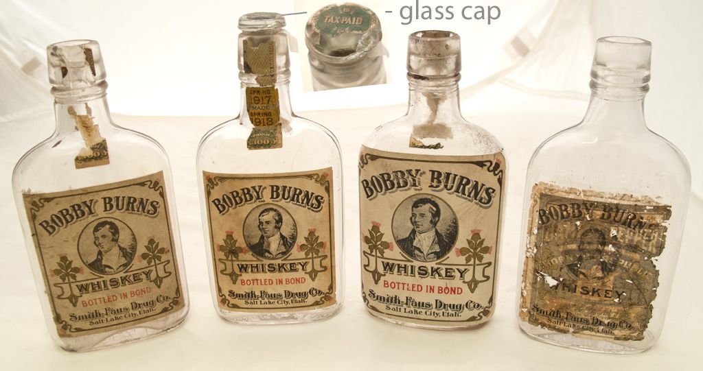 Smith-Faus Drub Company of Salt Lake City. Bottled in Bond. 100 proof. All four are marked 1/2 pint. All have paper labels with "SMITH-FAUS DRUG CO. SALT LAKE CITY, UTAH" printed across the bottom. All have single collar applied ground tops, with one of the bottles having a chip near the top. There is a partial revenue tax stamp on two of the half pints and one has the stamp and its glass stopper. Nice set! One shows fading.