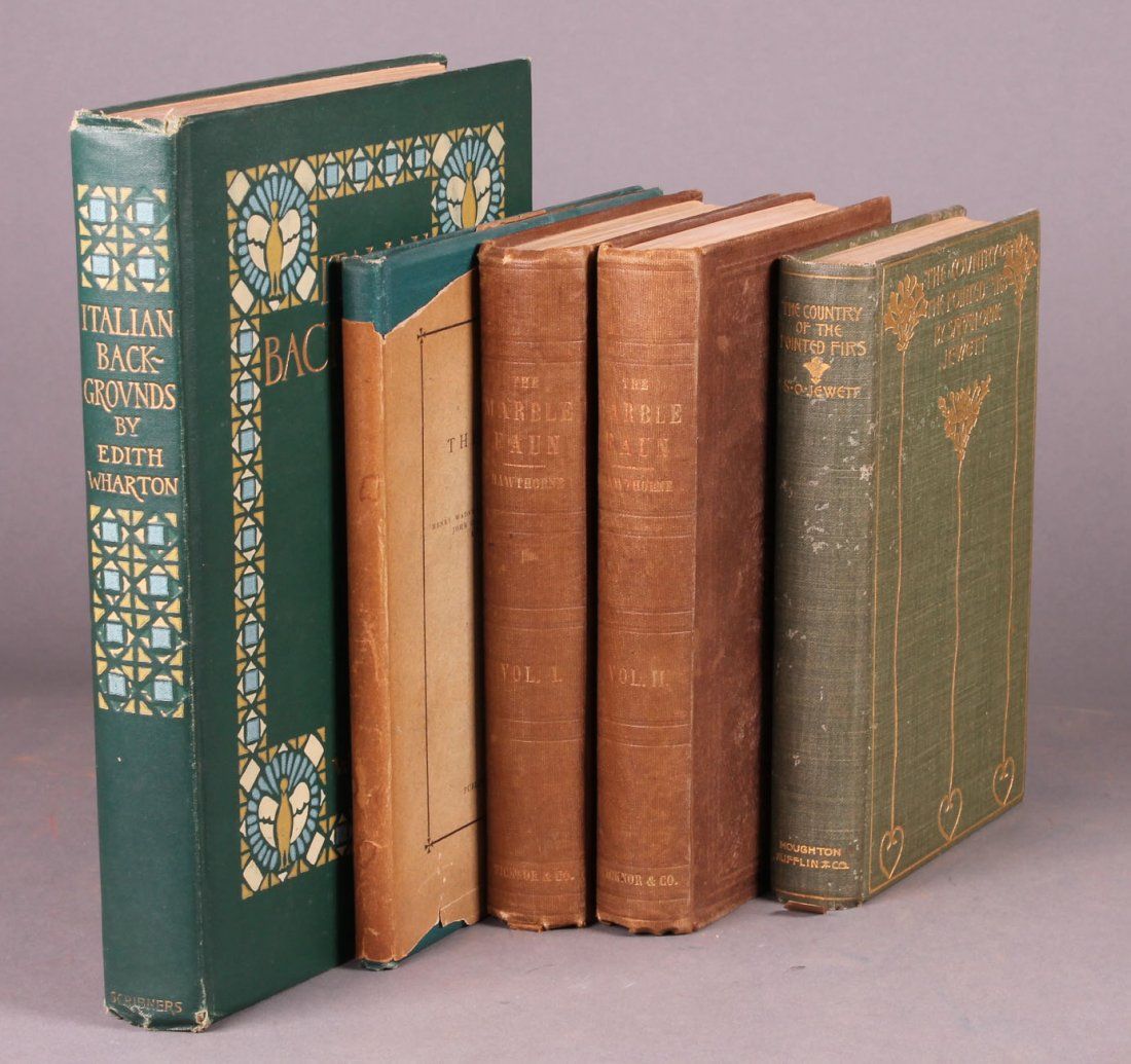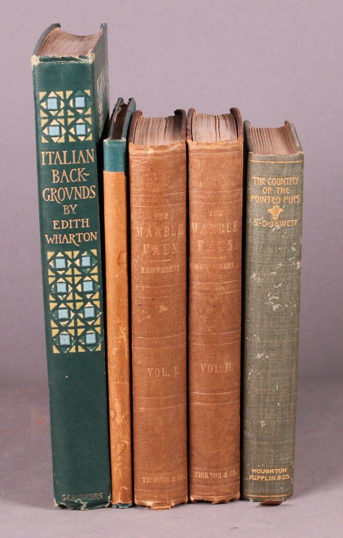 [American Literature]. 4 Titles (5 Vols). ++ Nathaniel Hawthorne. THE MARBLE FAUN; Or, the Romance of Monte Beni. 2 Vols. Bos: Ticknor and Fields, 1860. 12mo. Orig brown cloth. Vol I cocked. Vol II, pp105-118 sprung. Later issue, with ads dated May 1860. BAL 7621. ++ Sarah Orne Jewett. THE COUNTRY OF THE POINTED FIRS. Bos: Houghton Mifflin and Company, 1896. 12mo. Green gilt-stamped cloth. Minor scuffing, very good. ++ Edith Wharton. ITALIAN BACKGROUNDS. NY: Charles Scribner?s Sons, 1905. 8vo. Green dec cloth. Very good, slight dampstaining to rear cover, spine ends frayed. 13 plates (incl photogravure frontis). 1st edition. ++ POEMS OF THE ?OLD SOUTH? by Henry Wadsworth Longfellow, Oliver Wendell Holmes, John Greenleaf Whittier, Julia Ward Howe? Bos: South Fair Committee, 1879. Thin sq. 8vo. Green cloth. Very good in worn dj.