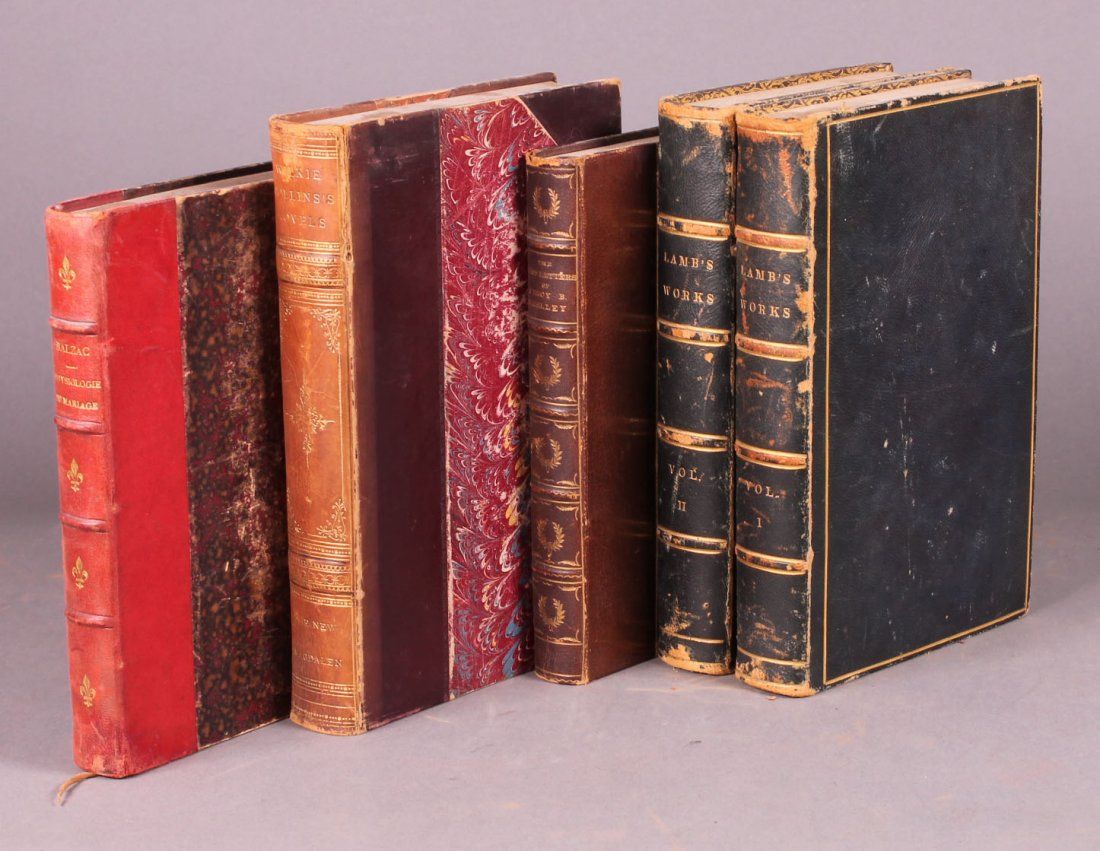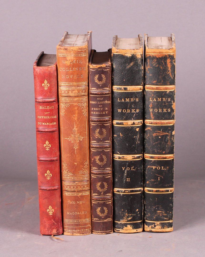 [Lamb/Other Authors]. 4 Titles (5 Vols). 12mo/8vo. Early half/full leather, marbled eps. ++ Thomas Noon Talfourd (ed.). THE WORKS OF CHARLES LAMB. To which are prefixed, his Letters, and a Sketch of his Life. 2 Vols. NY: Harper & Brothers, 1838. ++ Wilkie Collins. THE NEW MAGDALEN. NY: Harper & Brothers, (1873). 8vo. Half leather and marbled board, marbled edges & endpapers. Spine faded, edgewear to covers (esp. corners). Contents very good. ++ THE BEST LETTERS OF PERCY BYSSHE SHELLEY. Edited by Shirley Carter Hughson. Chi: A. C. McClurg and Company, 1892. Some wear to corners/edges of covers. Pages very good. ++ H. [Honore] de Balzac. PHYSIOLOGIE DU MARRIAGE ou Meditations de Philosophie Eclectique sur le Bonheur et le Malheur Conjugal. Paris: Levy, 1897. 8vo. [4], 430pp. Very good with some rubbing and edgewear to exterior. Usual tanning to pages, slight foxing.