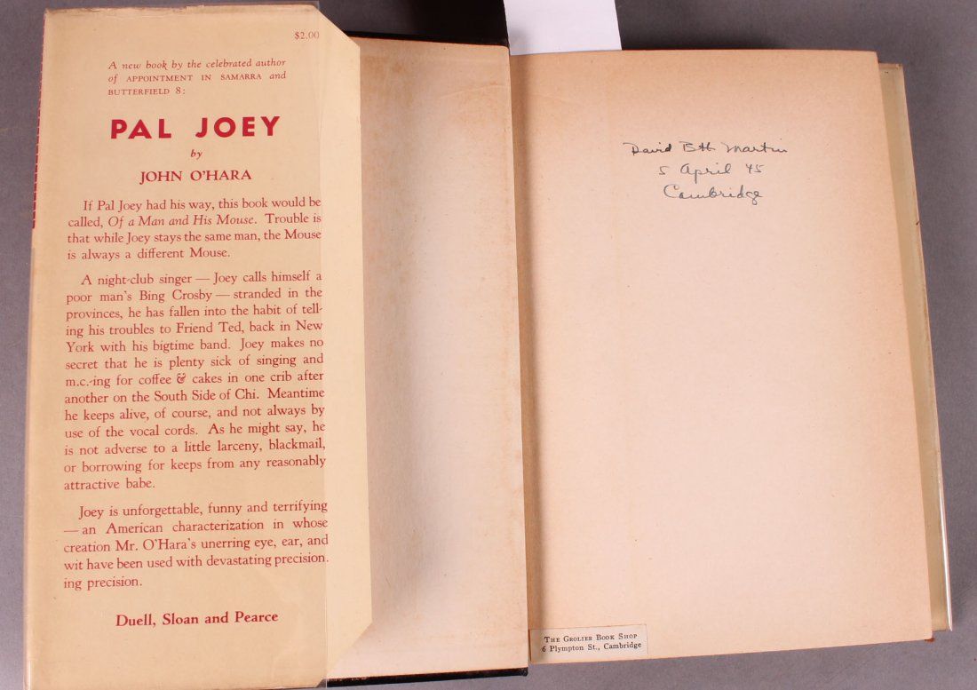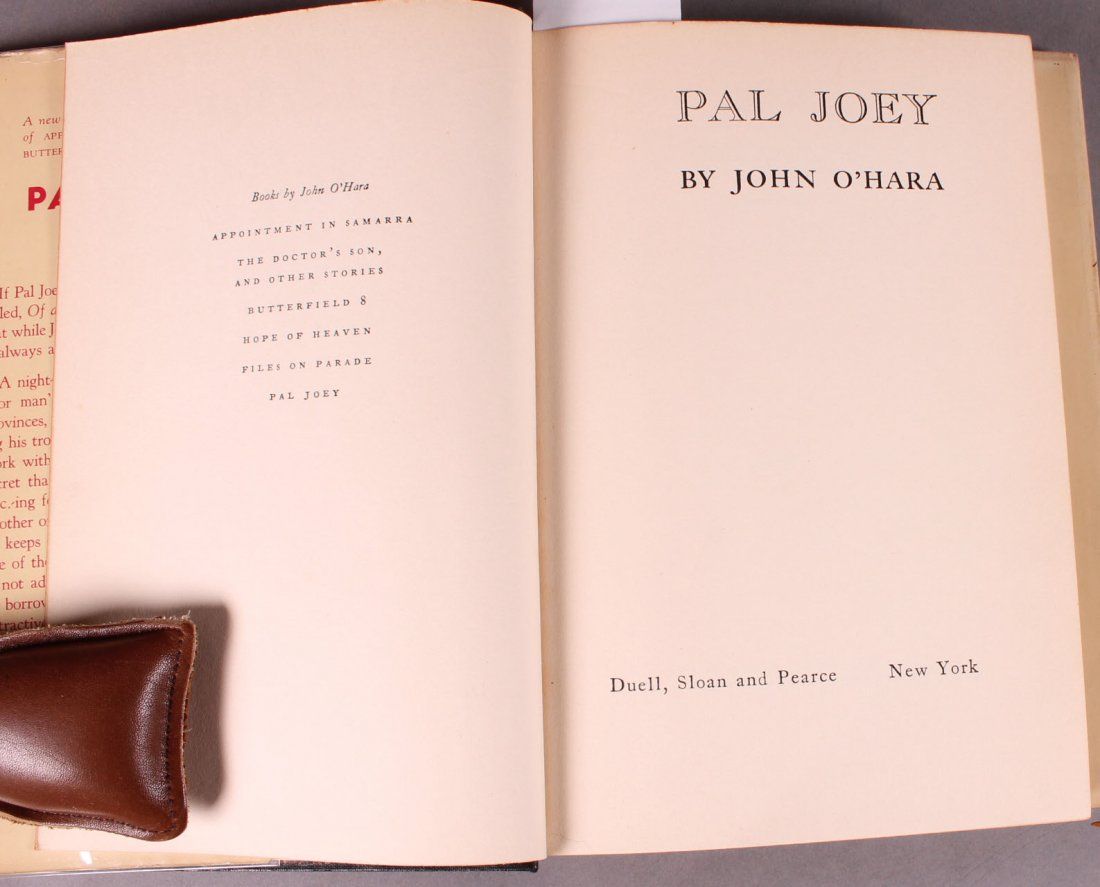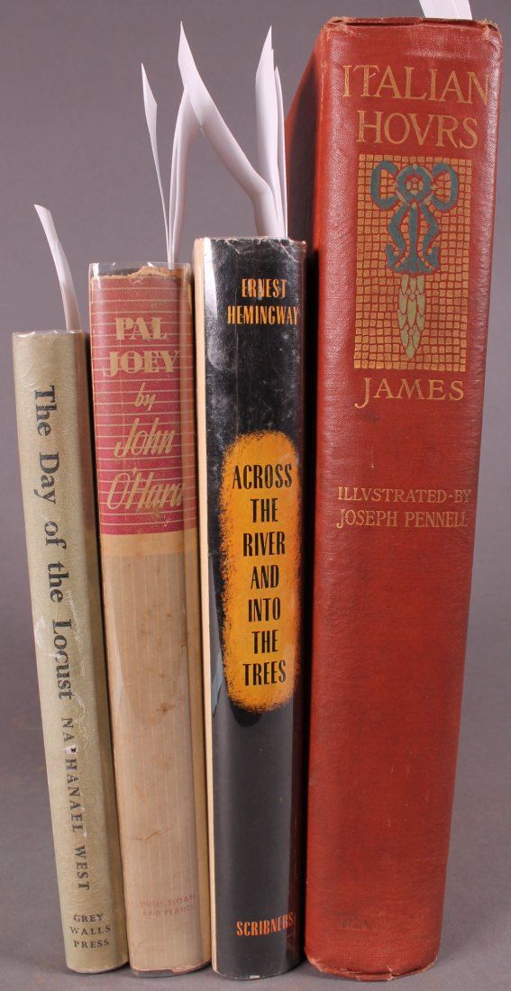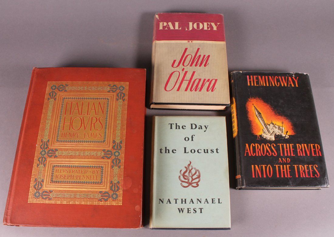 [Hemingway/O'Hara/Henry James]. 4 Titles. ++ Ernest Hemingway. ACROSS THE RIVER AND INTO THE TREES. NY: Charles Scribner?s Sons, 1950. 8vo. Black cloth. Lower edge of covers worn, very good in dj with creasing and minor tears (less than ? inch) near edges. 1st edition, in 2nd state dj (lettering more orange). Hanneman A23a. ++ John O?Hara. PAL JOEY. NY: Duell, Sloan and Pearce, (1940). 8vo. Very dark blue cloth very good in fair dj. Eps foxed. Ink Ownership on ffep. 1st edition, so stated. Bruccoli, VI, 1. ++ Nathanael West. THE DAY OF THE LOCUST. Lon: Grey Walls Press, (1951). 8vo. Navy blue cloth very good in very good dj. 1st British edition. Homer Simpson on "The Simpsons" is named after one of the main characters in this novel. ++ Henry James. ITALIAN HOURS. Illustrations by Joseph Pennell. Bos/NY: Houghton Mifflin, 1909. 4to. Orange-brown-red cloth. Minor surface soiling, frontis's tissue guard loose. Marginal crease to plate facing p204. Numerous color plates. 1st American trade edition. Edel & Laurence, "A Bibliography of Henry James," A67.