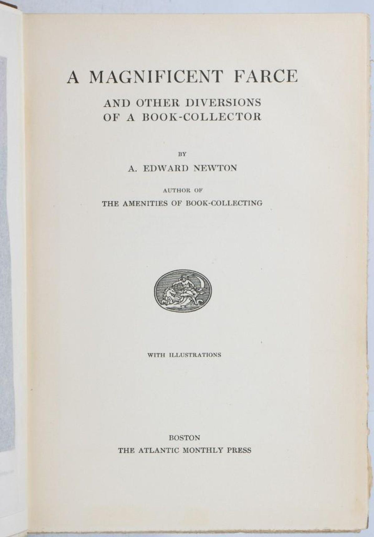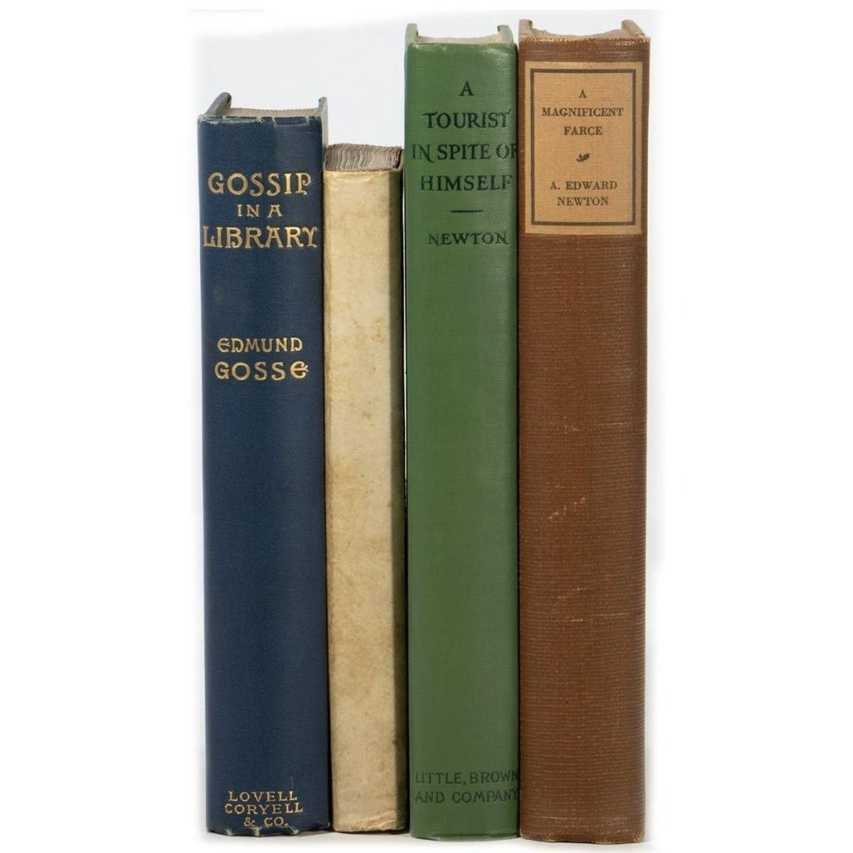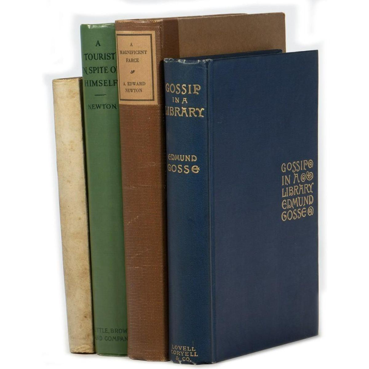 Group of four volumes on the history, collecting, appreciation of books, including a presentation copy with tipped-in letter from Charles F. Richardson to American literary critic E. C. Stedman; varying Good-Very Good condition: 1. GOSSE, EDMUND. Gossip in a Library. New York: Lovell, Coryell & Company, 1891. First American edition. 2.-3. NEWTON, A. EDWARD. A Tourist in Spite of Himself. Illustrations by Gluyas Williams. Boston: Little, Brown, and Company, 1930. Third edition. And, A Magnificent Farce and Other Diversions of a Book-Collector. Boston: The Atlantic Monthly Press, 1921. Third impression. 4. RICHARDSON, CHARLES E. The Choice of Books. London: Sampson, Lowe, Marston, Searle, & Rivington, 1881. Signed with presentation inscription from the author to literary critic E. C. Stedman, and a tipped-in letter from Richardson to Stedman dated 1881. Richardson tells Stedman that he is now "the American literary critic." Stedman's bookplate on pastedown.