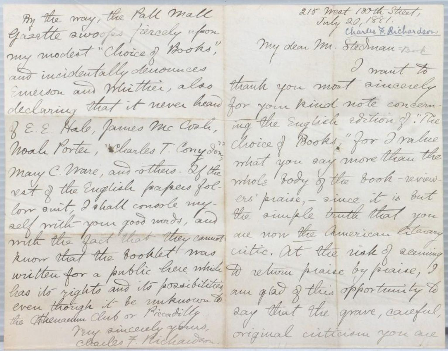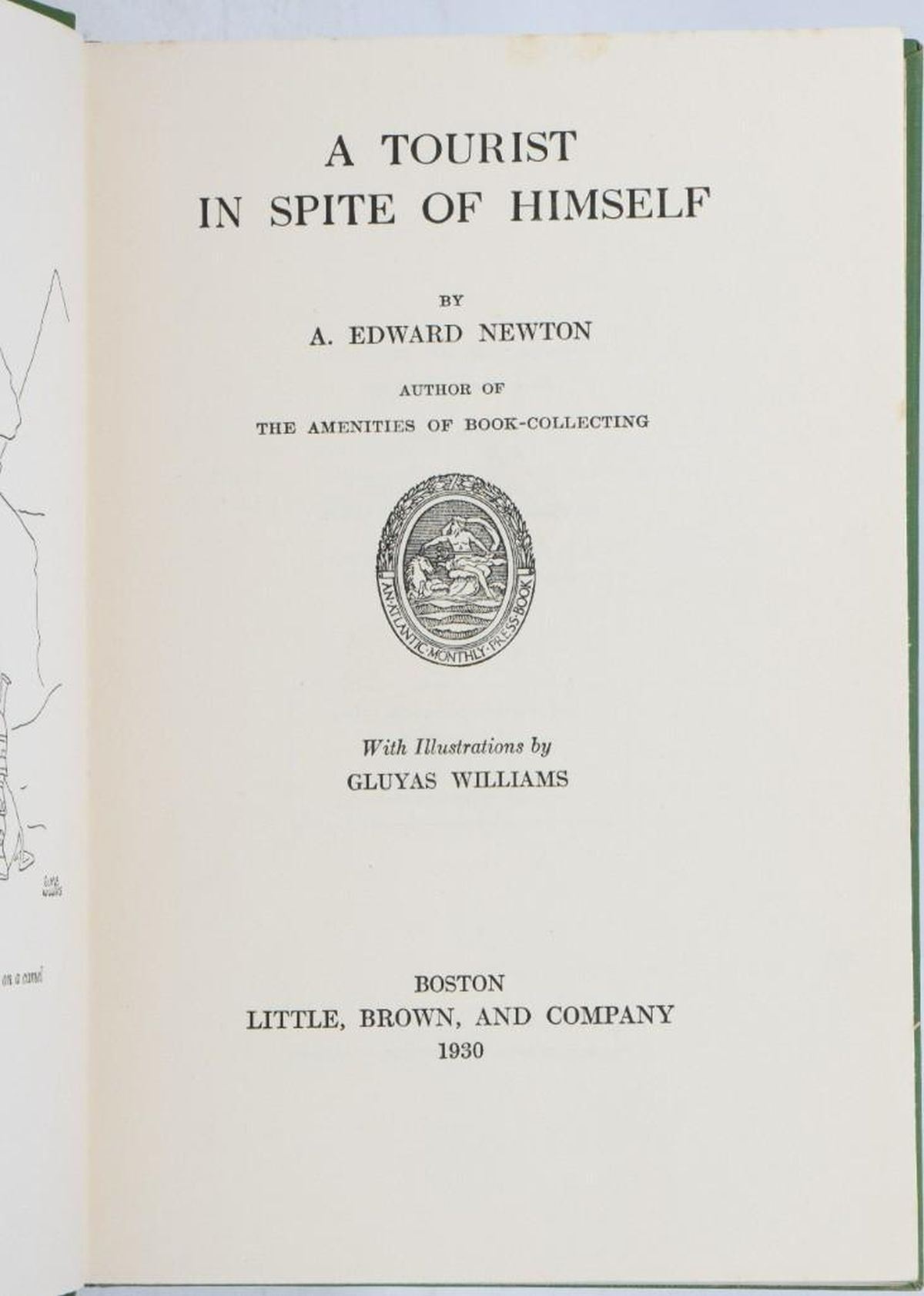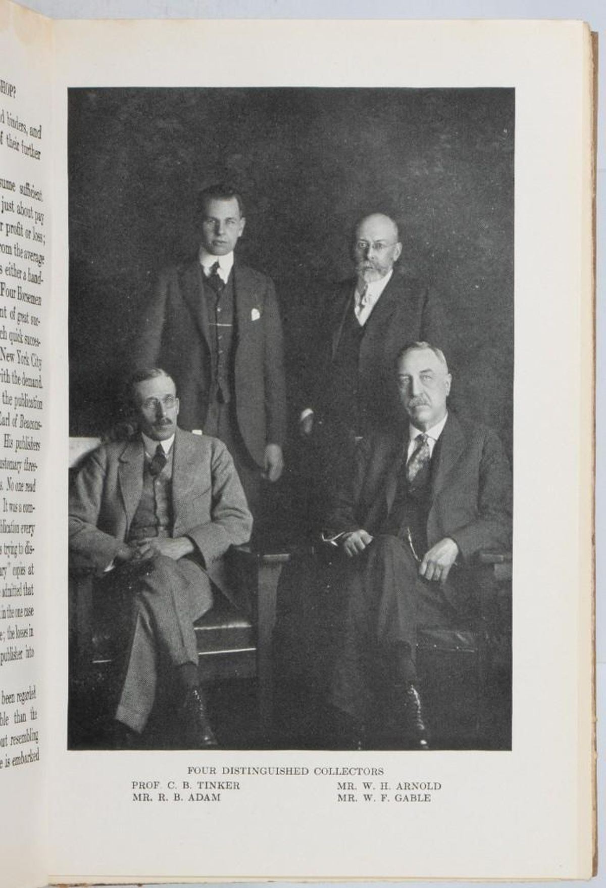 Group of four volumes on the history, collecting, appreciation of books, including a presentation copy with tipped-in letter from Charles F. Richardson to American literary critic E. C. Stedman; varying Good-Very Good condition: 1. GOSSE, EDMUND. Gossip in a Library. New York: Lovell, Coryell & Company, 1891. First American edition. 2.-3. NEWTON, A. EDWARD. A Tourist in Spite of Himself. Illustrations by Gluyas Williams. Boston: Little, Brown, and Company, 1930. Third edition. And, A Magnificent Farce and Other Diversions of a Book-Collector. Boston: The Atlantic Monthly Press, 1921. Third impression. 4. RICHARDSON, CHARLES E. The Choice of Books. London: Sampson, Lowe, Marston, Searle, & Rivington, 1881. Signed with presentation inscription from the author to literary critic E. C. Stedman, and a tipped-in letter from Richardson to Stedman dated 1881. Richardson tells Stedman that he is now "the American literary critic." Stedman's bookplate on pastedown.