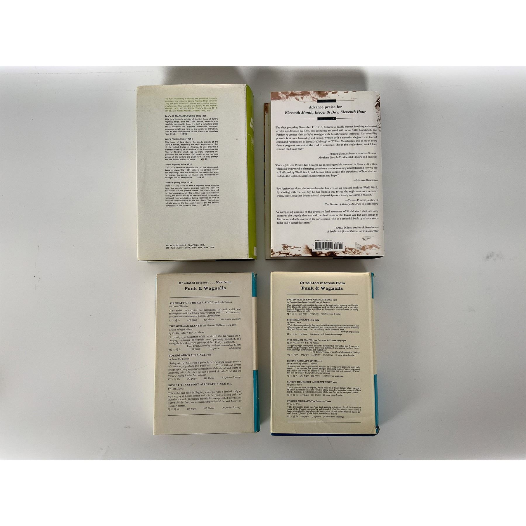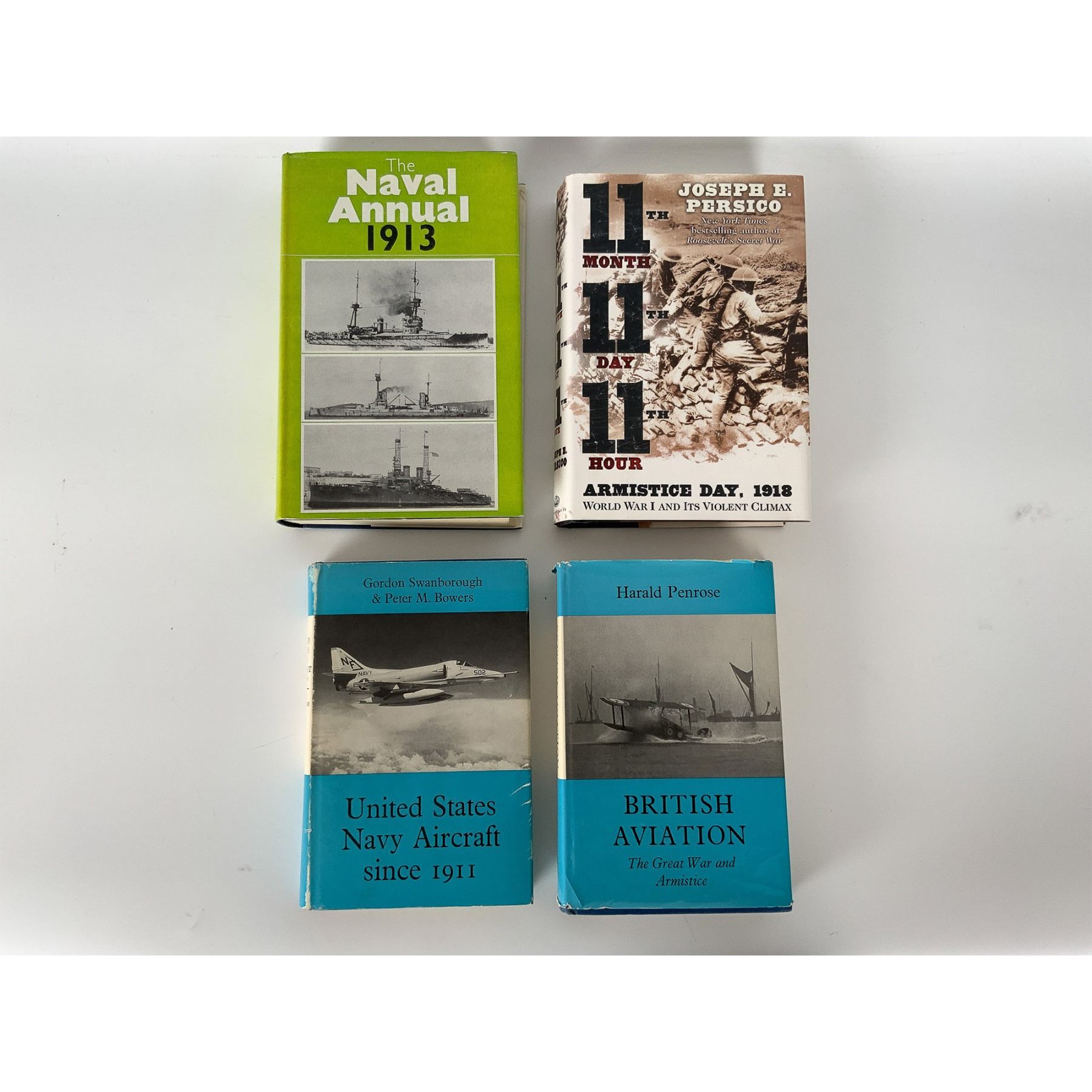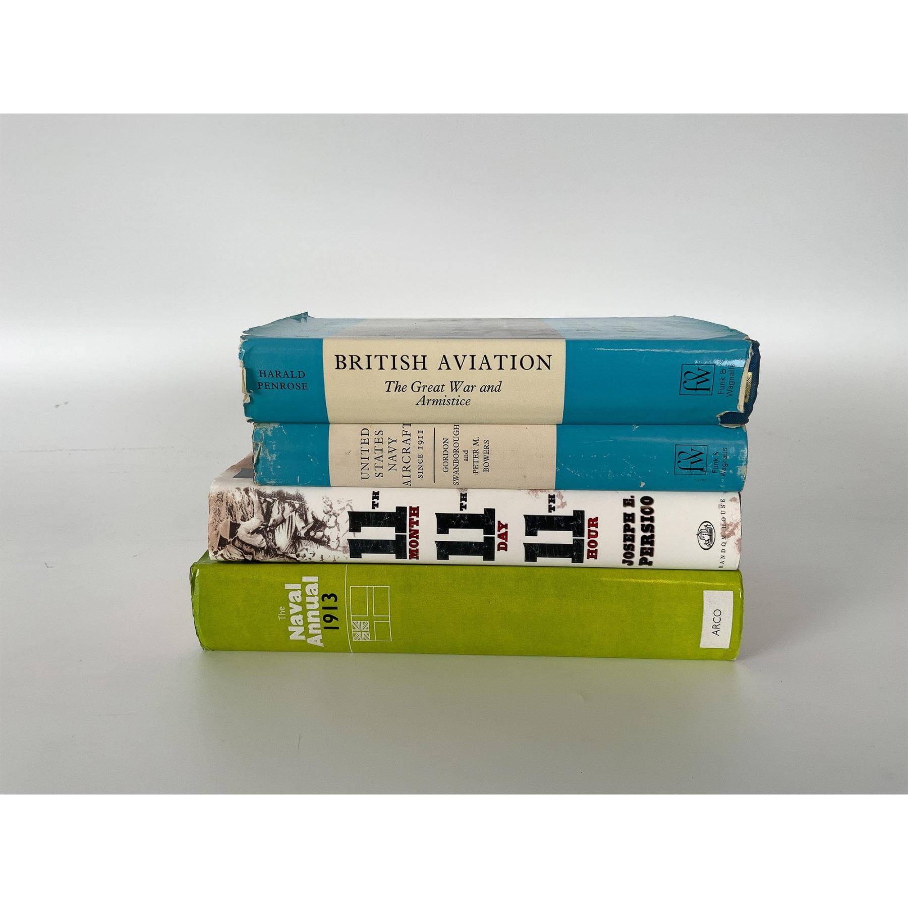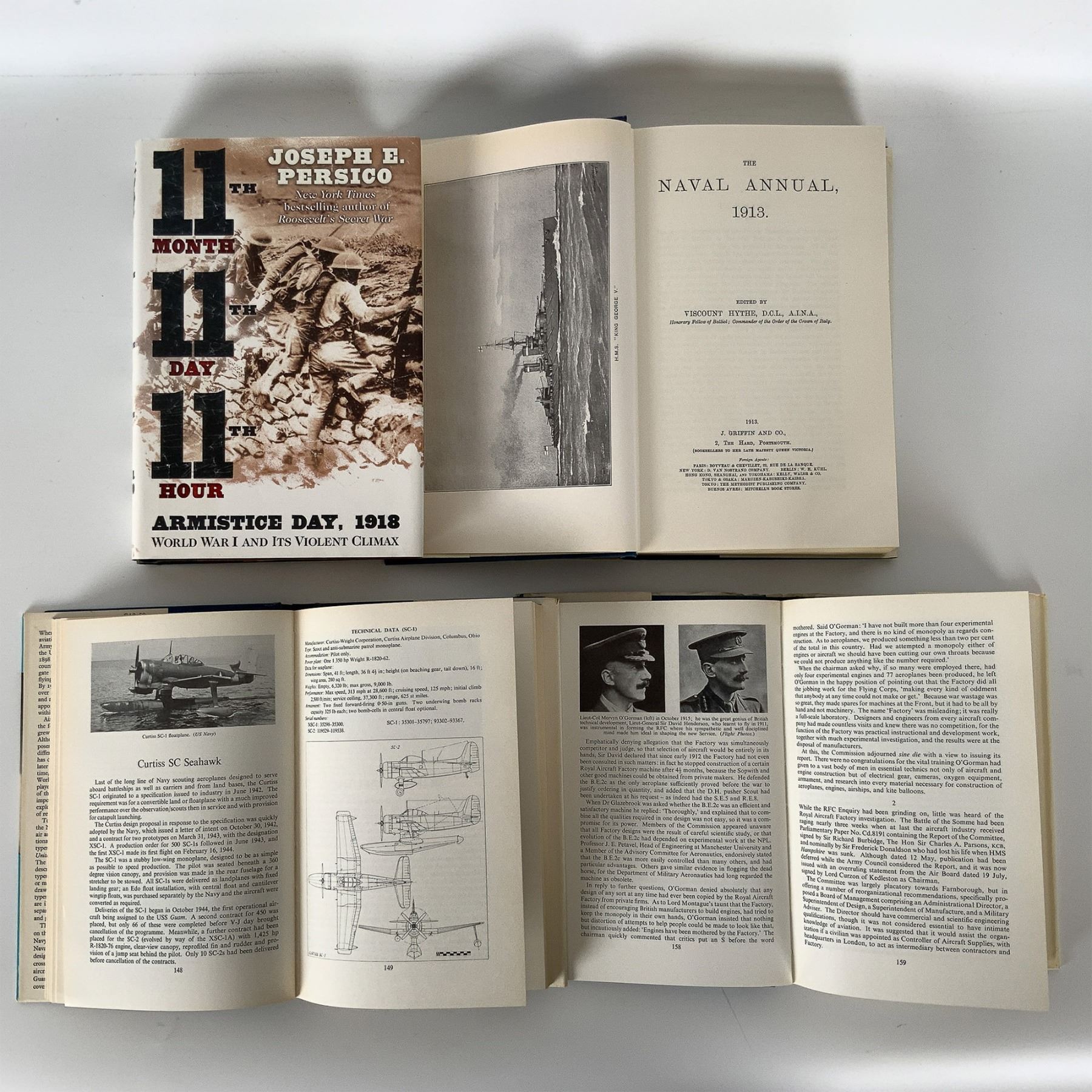 This lot features four hardcover books exploring significant aspects of military and aviation history. Included is British Aviation: The Great War and Armistice by Harald Penrose, an insightful account of Britain's aviation development during World War I. Also present is United States Navy Aircraft Since 1911 by Gordon Swanborough and Peter M. Bowers, a comprehensive reference detailing the evolution of naval aircraft in the U.S. Navy. Another highlight is 11th Month, 11th Day, 11th Hour by Joseph E. Persico, which provides a gripping narrative of the final moments of World War I. Rounding out the collection is The Naval Annual 1913, an essential historical record offering contemporary analysis of naval power leading up to World War I. These books are valuable resources for historians, collectors, and enthusiasts of military and aviation history.