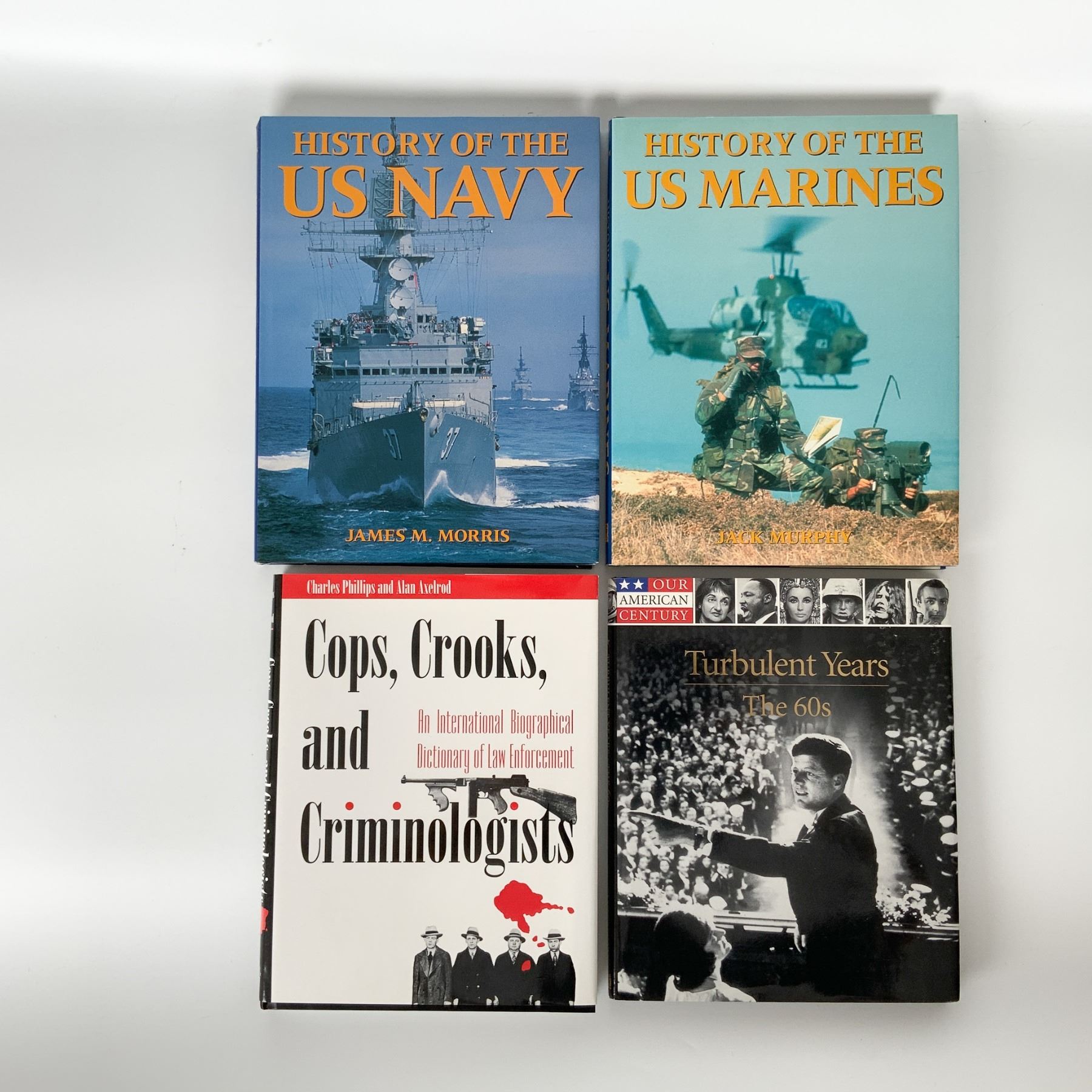 This lot features a collection of four hardcover books covering key aspects of American history, law enforcement, and military history. Included are Turbulent Years: The 60s, a historical overview of the significant social and political events of the 1960s; Cops, Crooks, and Criminologists, an exploration of law enforcement and crime investigations; History of the U.S. Marines and History of the U.S. Navy, both detailing the evolution, major battles, and contributions of these military branches. These books provide valuable insight into pivotal moments in American history, making them excellent additions for collectors, history enthusiasts, or research libraries.