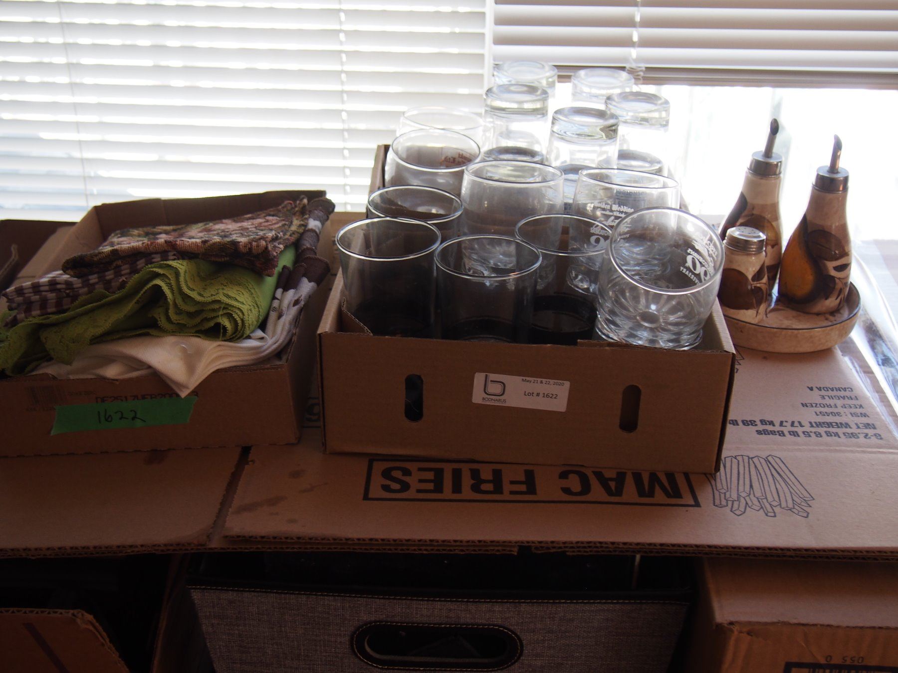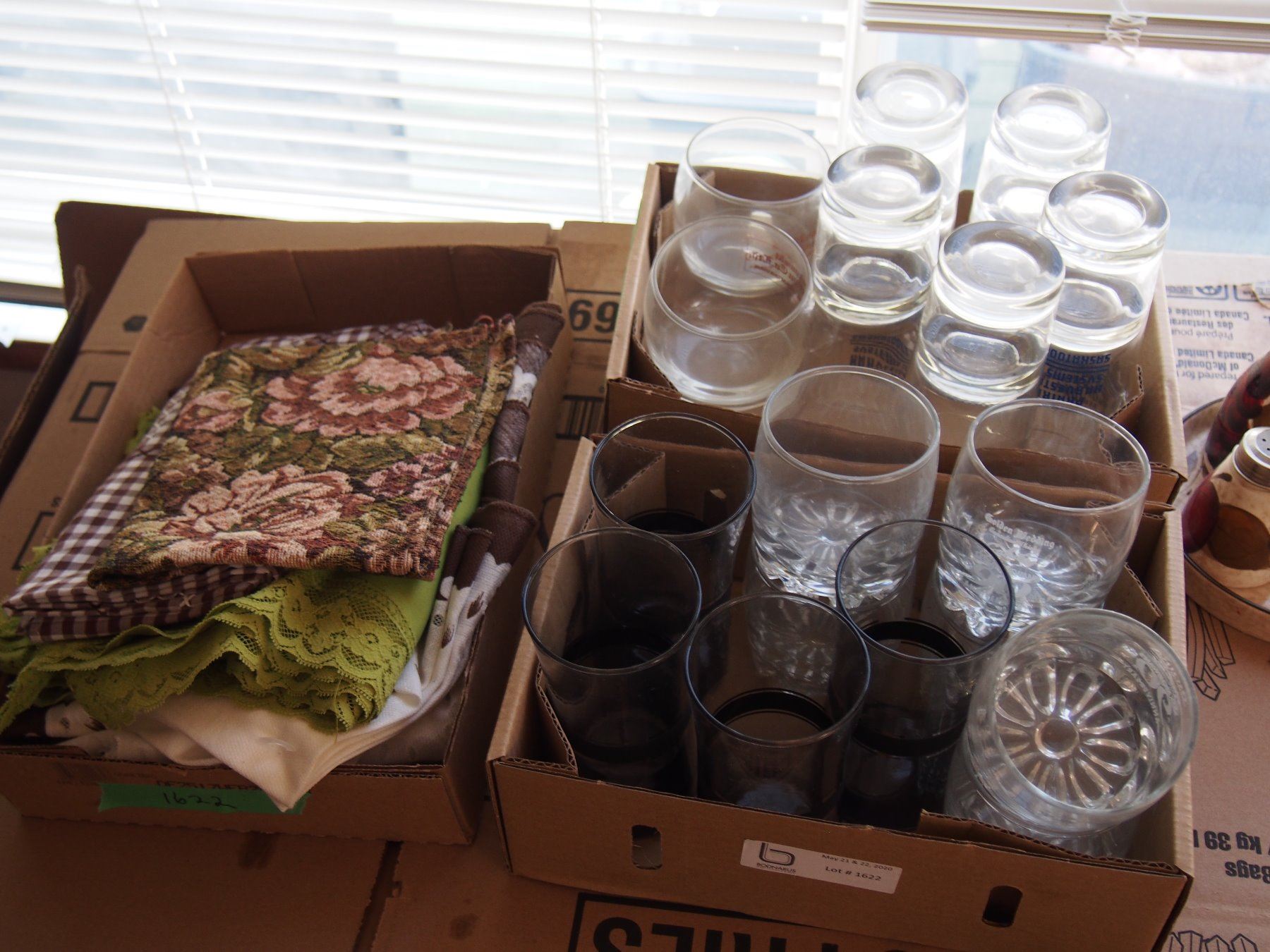 4 Boxes of Glassware and Kitchen Related Assorted Linen
