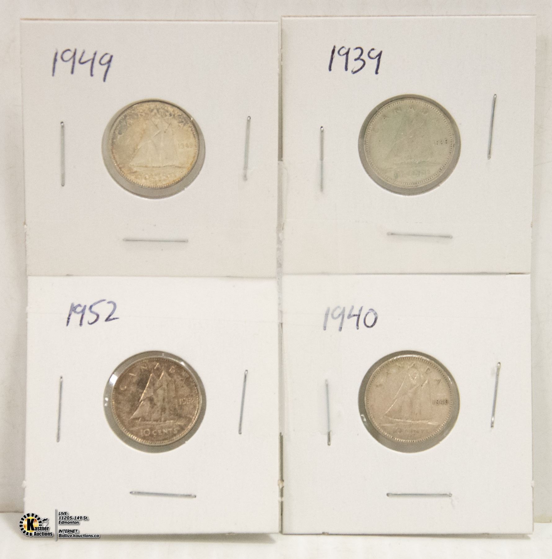 4 CANADIAN SILVER 10 CENT 1939-40-49-52