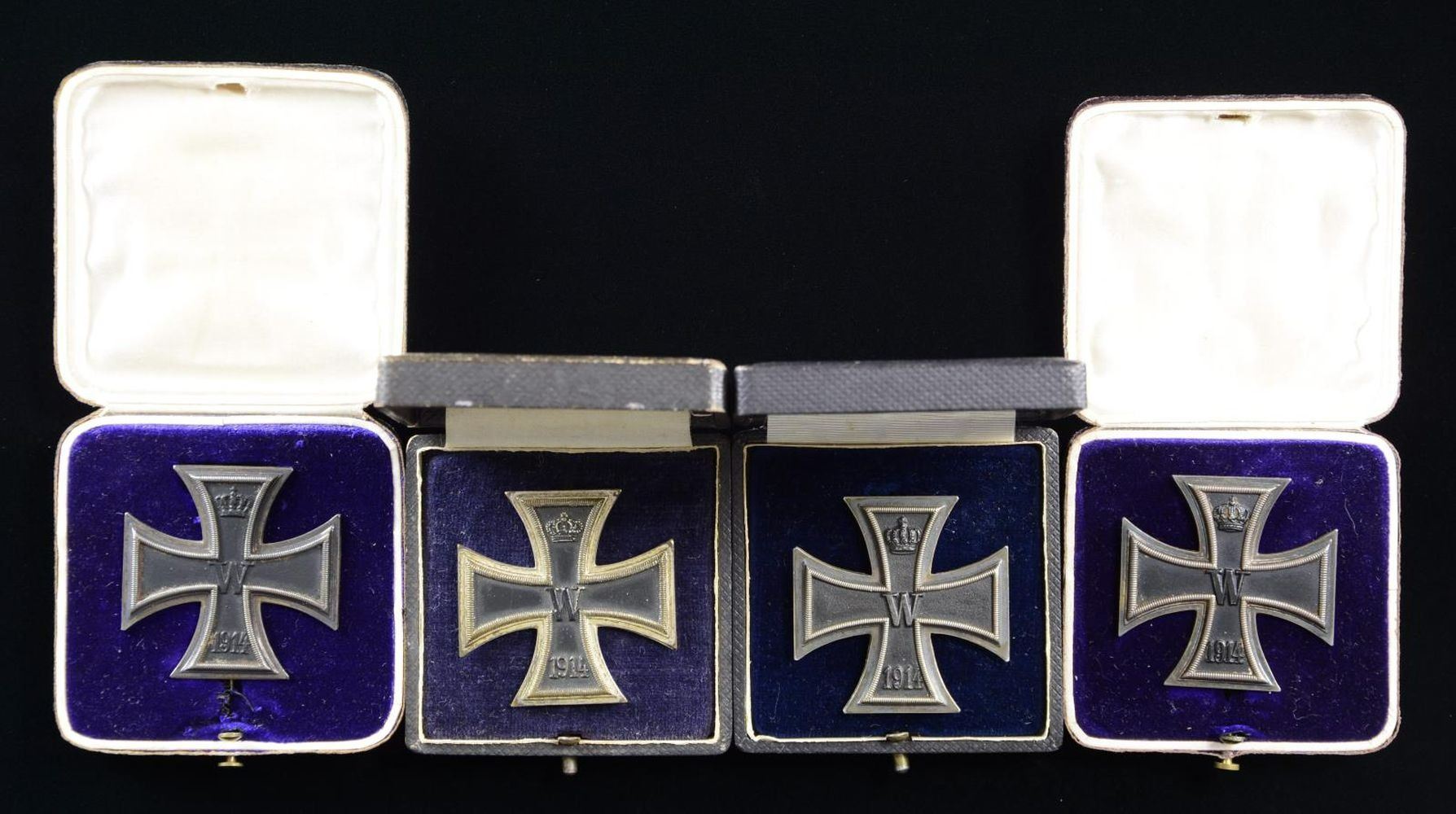 1) This Cross has a magnetic center & a silver back with a wide pin that is marked “K.A.G.”. The 2 1/2" square leather covered case has a deep blue interior with a white silk pad. The top of the lid has an embossed silver Iron Cross. 2) This Cross has a magnetic center & a silvered back with a wide pin. The 2 1/2" square leather covered case has a deep purple interior with a white silk pad. The top of the lid has an embossed silver Iron Cross. 3) This Cross has a magnetic center & a silver back with a wide pin. The 2 1/2" square leather covered case has a royal purple interior with a white silk pad. The top of the lid is embossed with a gold Iron Cross. 4) This Cross has a magnetic center & a silver back with a wide pin. The 2 1/2" square leather covered case has a royal purple interior with a white silk pad. The top of the lid is embossed with a silver Iron Cross. CONDITION: all Crosses show light wear. Two cases show very light wear, and two show moderate wear. PROVENANCE: From the Lifelong Collection of Glen E. Mattox. (02-18909-2/BF). $600-800.