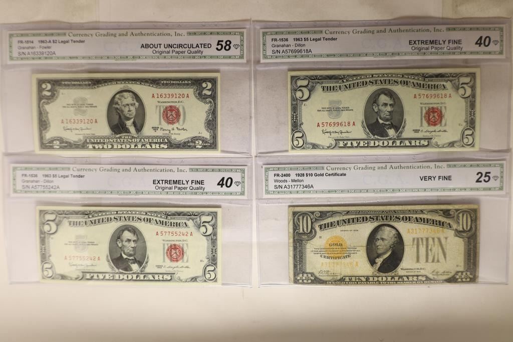 1963 $5 RED SEAL US NOTE EXTRA FINE 40, 1963 $5 RED SEAL US NOTE EXTRA FINE 40 AND 1928 $10 GOLD CERTIFICATE VERY FINE 25