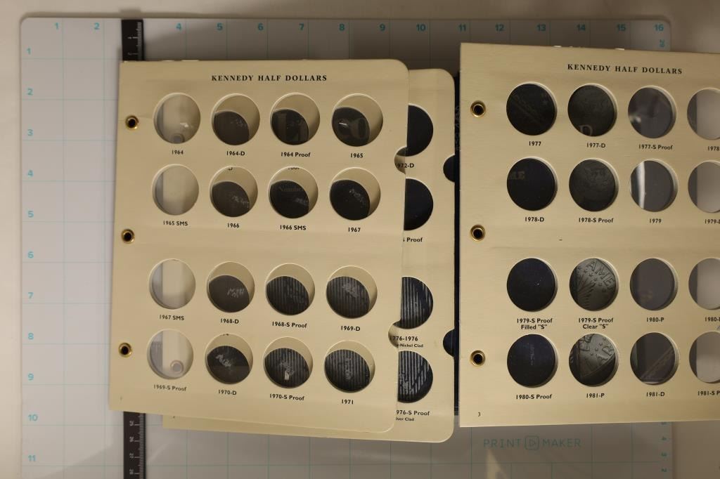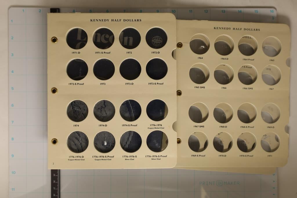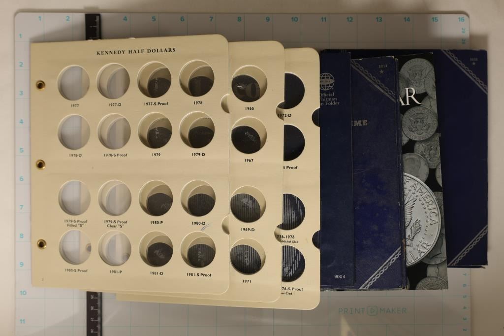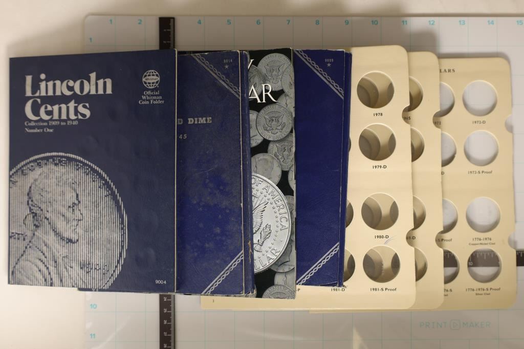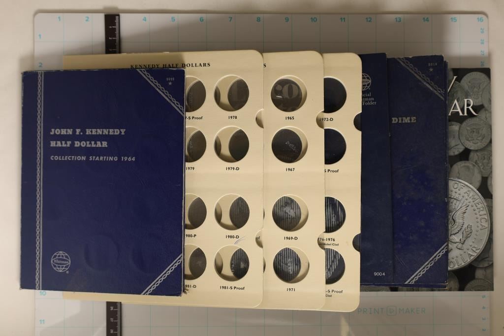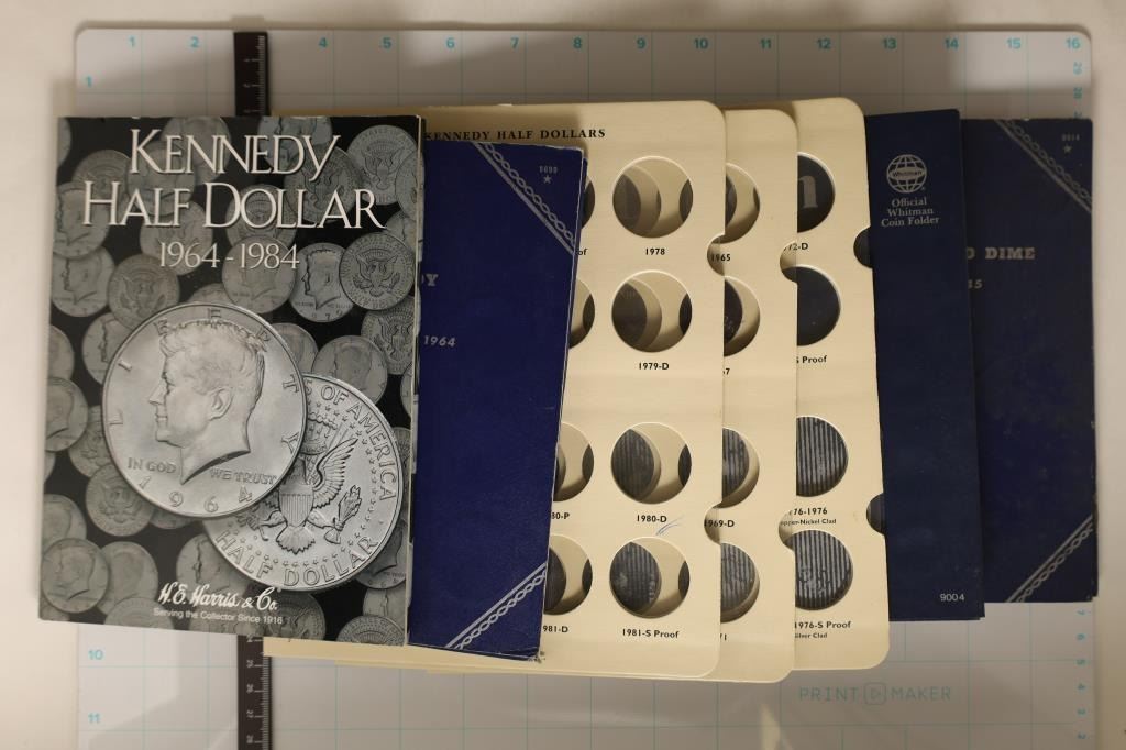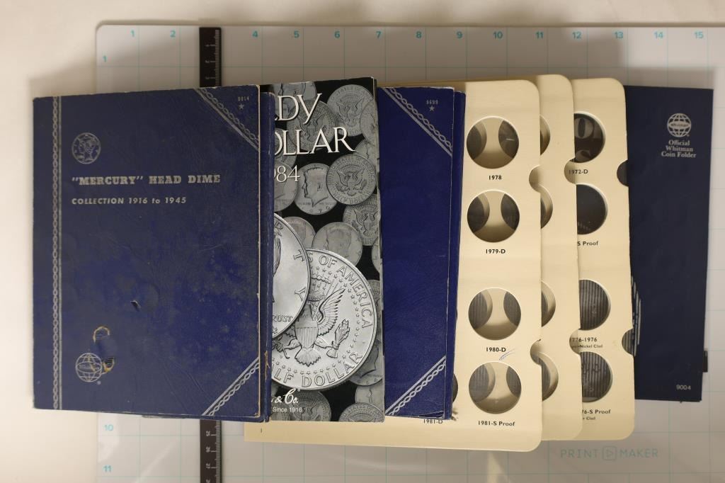 CENT 1909 TO 1940, WHITMAN MERCURY HEAD DIME 1916 TO 1945 (DAMAGE TO FRONT COVER), H.E. HARRIS & CO. KENNEDY HALF DOLLAR 1964-1984 AND WHITMAN JOHN F. KENNEDY HALF DOLLAR STARTING 1964. THE 3 PAGES ARE KENNEDY HALF