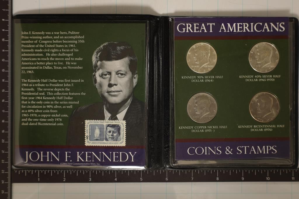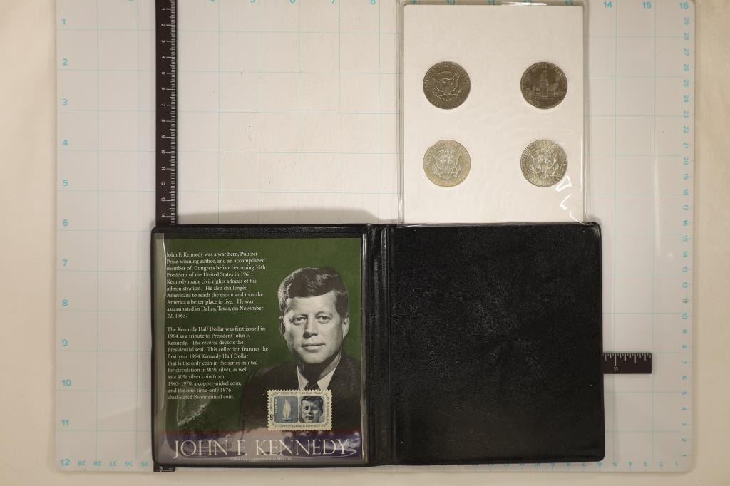 1964 JFK 90% SILVER, 1967 JFK 40% SILVER. 1971 AND 1976-D BICENTENNIAL HALF DOLLAR IN FIRST COMMEMORATIVE MINT FOLIO