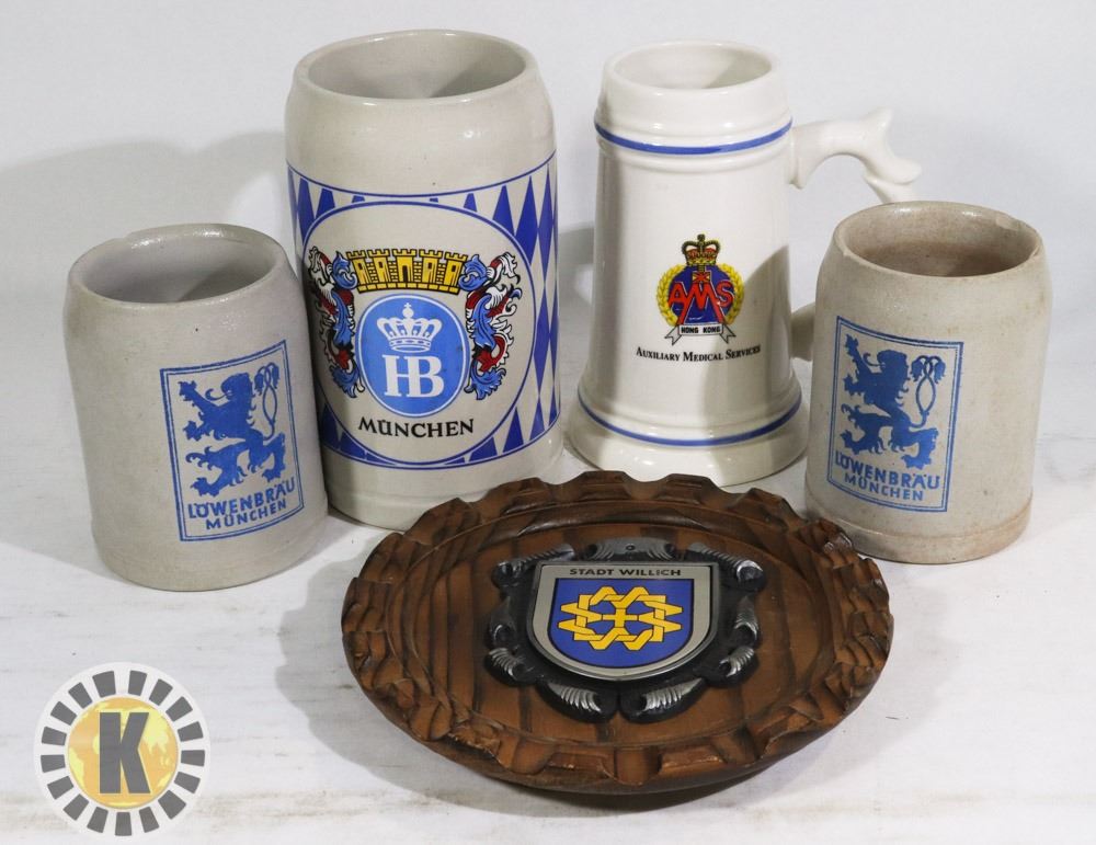 4 COLLECTIBLE BEER STEINS & 1 DECORATIVE ART/PLATE