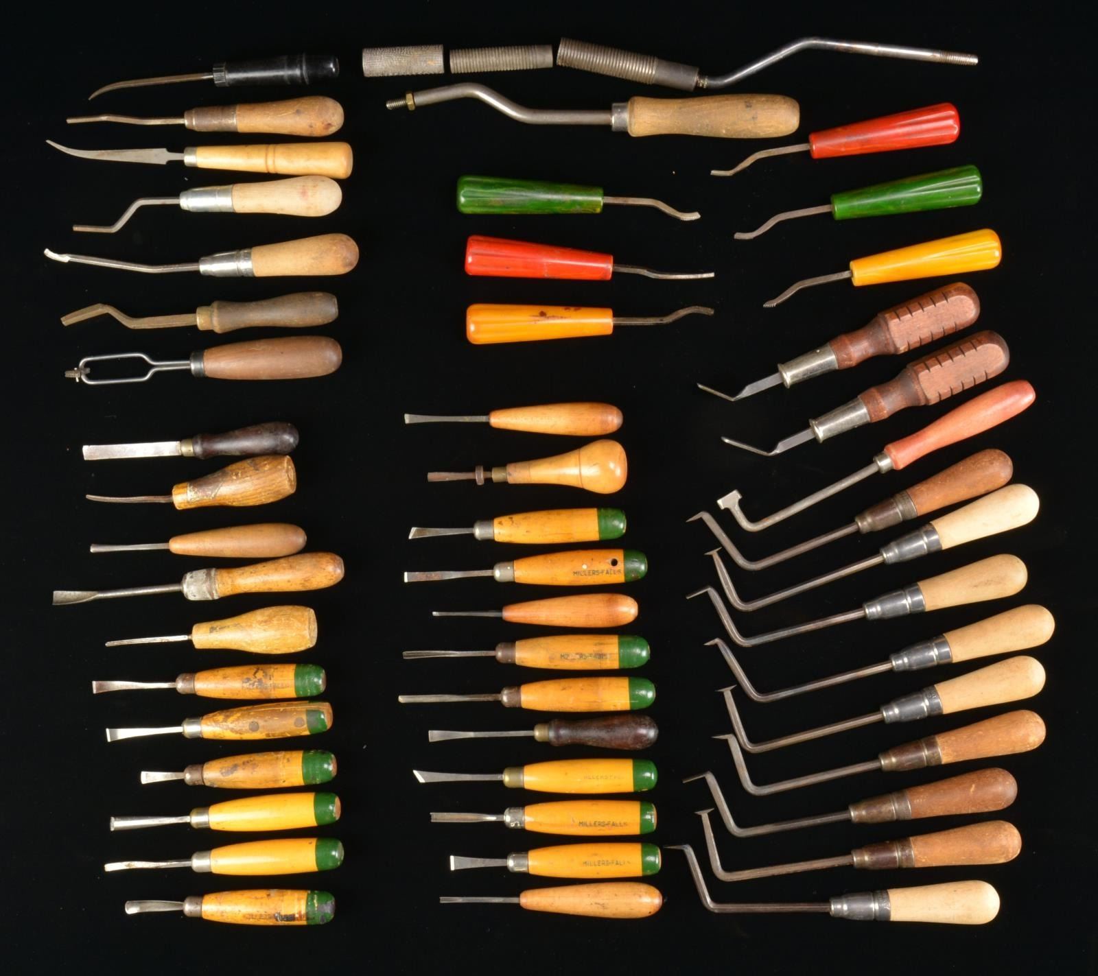 MAKING. Cardboard box w/ checkering tools. / 7 Older tools w/ yellow plastic handles. / 6 “Gun Line” handles w/ various cutters. / 6 Or so “Dem-Bart” handles / lg. bag w/ approx. 30 “Dem-Bart & Gun” Line cutters. / White first aid kit box w/ bbl. channel rasps & some bottoming files & scrapers. / Another first aid kit box w/ 12 bottoming chisels of various profiles & sizes. / Toffee tin containing approx. 20 “Millers Falls” veiners, spoon gouges, slitting chisels, a graver along w/ some bent riffling files, etc. CONDITION: many tools show wear, but are usable. (02-14184-3/MGM). $100-300.