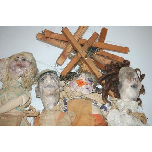 (4) CONTINENTAL MARIONETTES - (4) DIFFERENT 20TH CENT. EUROPEAN FOLK ART MARIONETTE PUPPETS W/ WAX & PAPIER MACHE HEADS, HANDS & FEET IN HANDMADE & FANCY DOLL GARMENTS: (1) LEPRECHAUN, (1) GIRL & AN ADULT COUPLE - TANGLED, NEEDS RESTRINGING, WEAR, LOSSES, SOILING, IMPERFECTIONS