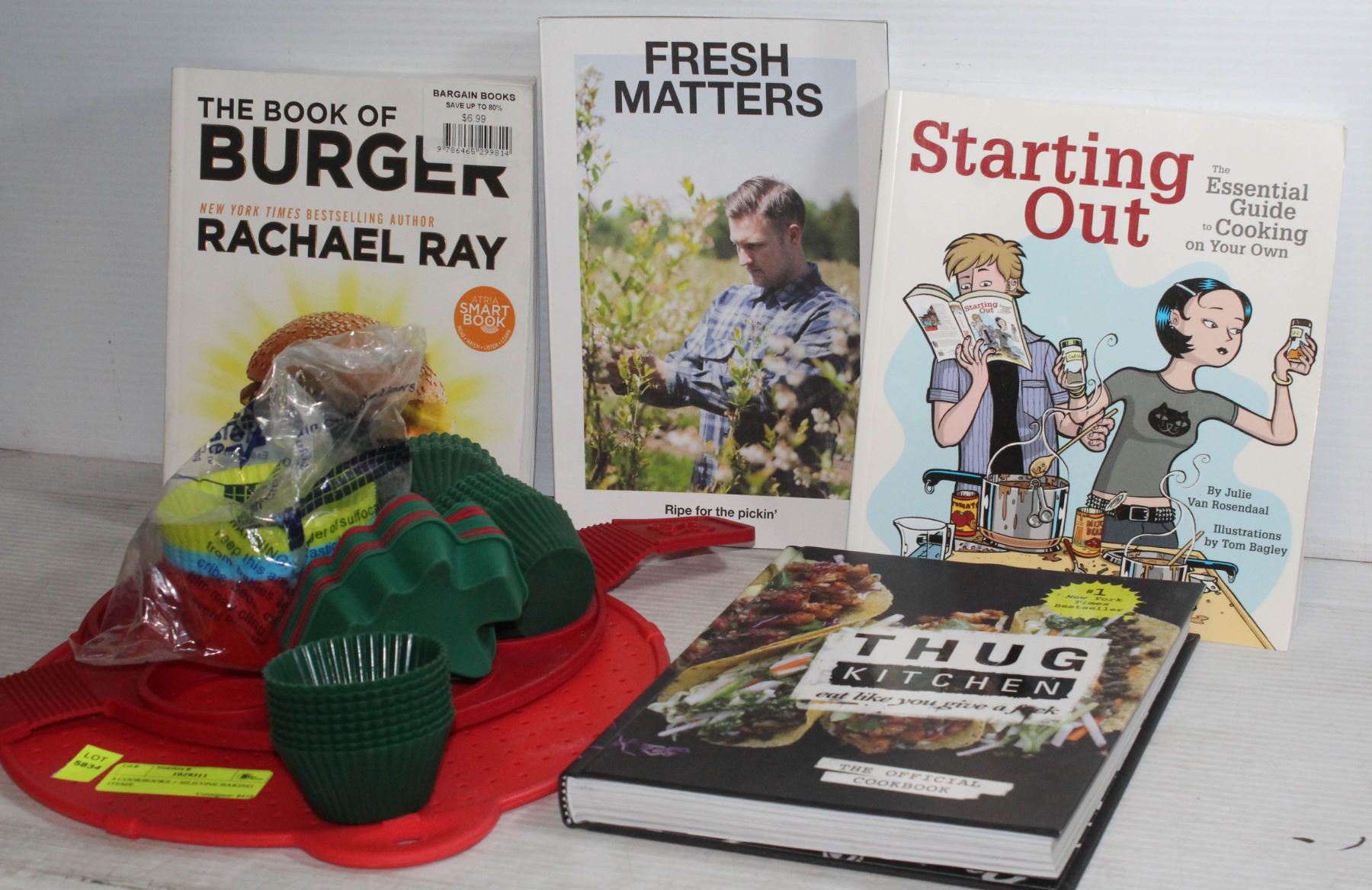 4 COOKBOOKS + SILICONE BAKING ITEMS.