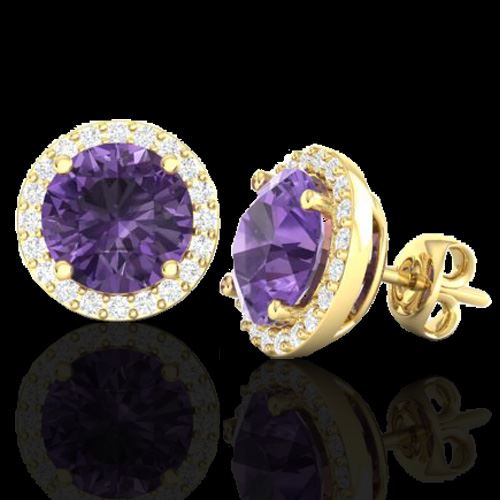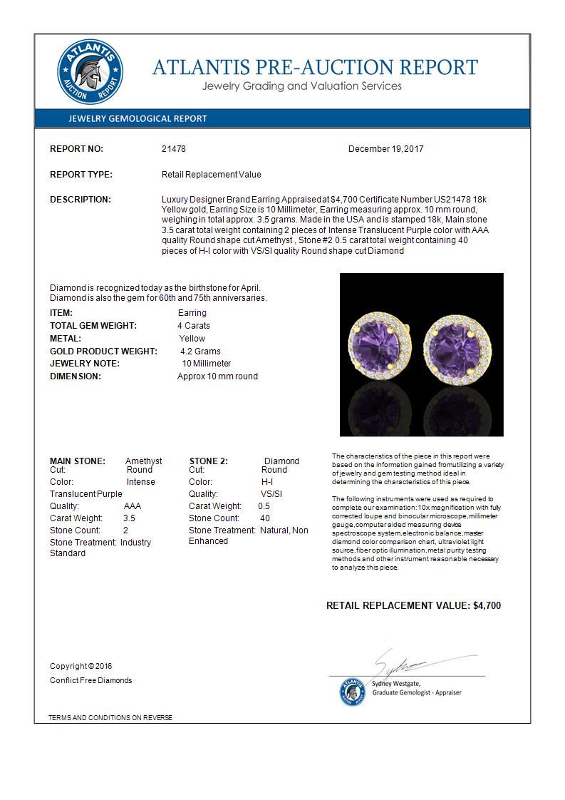 REF-65K8W -21478 ---- 4 CTW Amethyst & Halo VS/SI Diamond Micro Pave Earrings Solitaire 18K Yellow Gold ---- Luxury Designer Brand Earring Appraised at $4,700 Certificate Number US21478 18k Yellow gold, Earring Size is 10 Millimeter, Earring measuring approx. 10 mm round, weighing in total approx. 3.5 grams. Made in the USA and is stamped 18k, Main stone 3.5 carat total weight containing 2 pieces of Intense Translucent Purple color with AAA quality Round shape cut Amethyst , Stone #2 0.5 carat total weight containing 40 pieces of H-I color with VS/SI quality Round shape cut Diamond