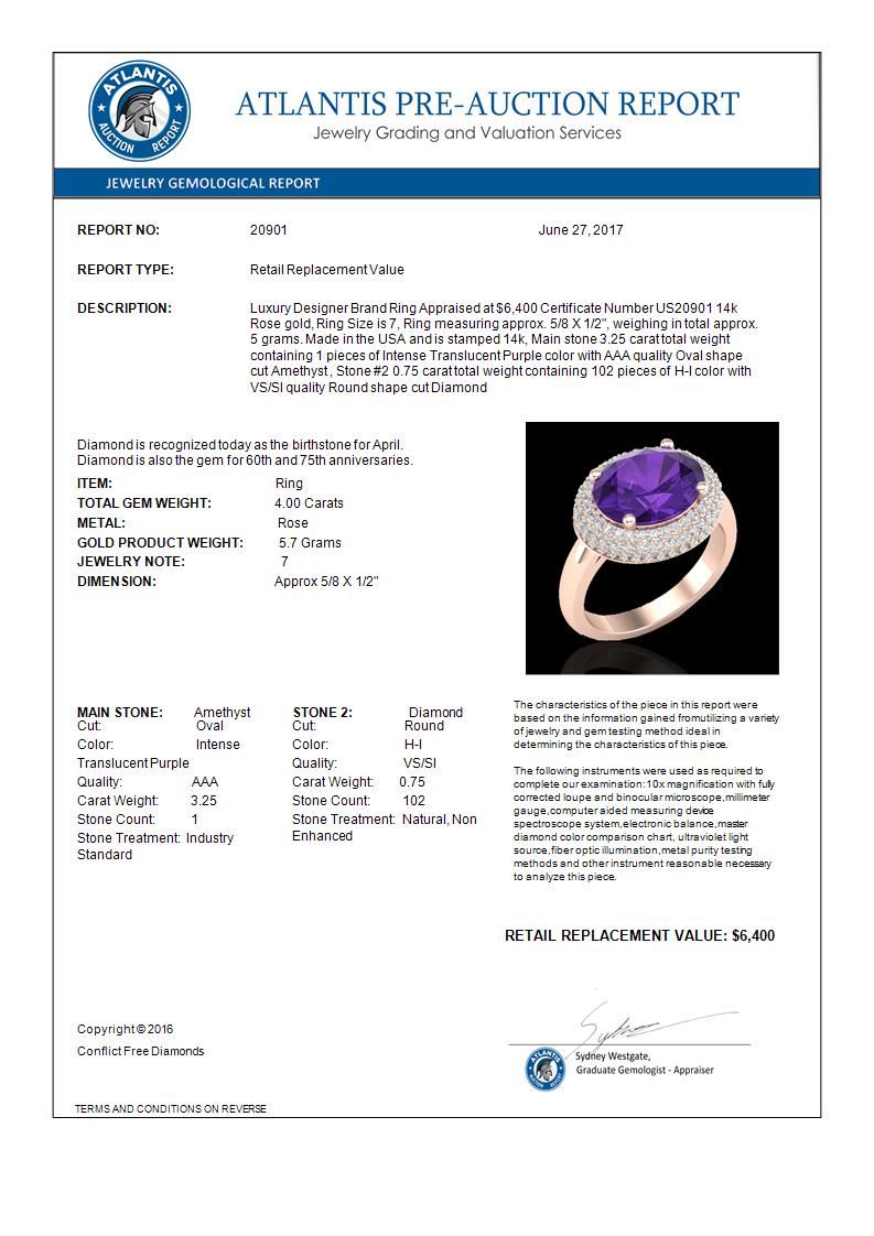 4 CTW Amethyst & Micro Pave VS/SI Diamond Certified Ring 14K Rose Gold ---- Luxury Designer Brand Ring Appraised Retail Price at $6,400 ---- SKU Number US20901 14k Rose gold Ring Size is 7, Ring measuring approx. 5/8 X 1/2", weighing in total approx. 5 grams. Made in the USA and is stamped 14k, Main stone 3.25 carat total weight containing 1 pieces of Intense Translucent Purple color with AAA quality Oval shape cut Amethyst , Stone #2 0.75 carat total weight containing 102 pieces of H-I color with VS/SI quality Round shape cut