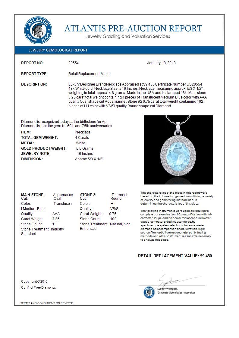 REF-122W8F -20554 ---- 4 CTW Aquamarine & Micro Pave VS/SI Diamond Necklace 18K White Gold ---- Luxury Designer Brand Necklace Appraised at $9,450 Certificate Number US20554 18k White gold, Necklace Size is 16 Inches, Necklace measuring approx. 5/8 X 1/2", weighing in total approx. 4.8 grams. Made in the USA and is stamped 18k, Main stone 3.25 carat total weight containing 1 pieces of Translucent Medium Blue color with AAA quality Oval shape cut Aquamarine , Stone #2 0.75 carat total weight containing 102 pieces of H-I color with VS/SI quality Round shape cut Diamond