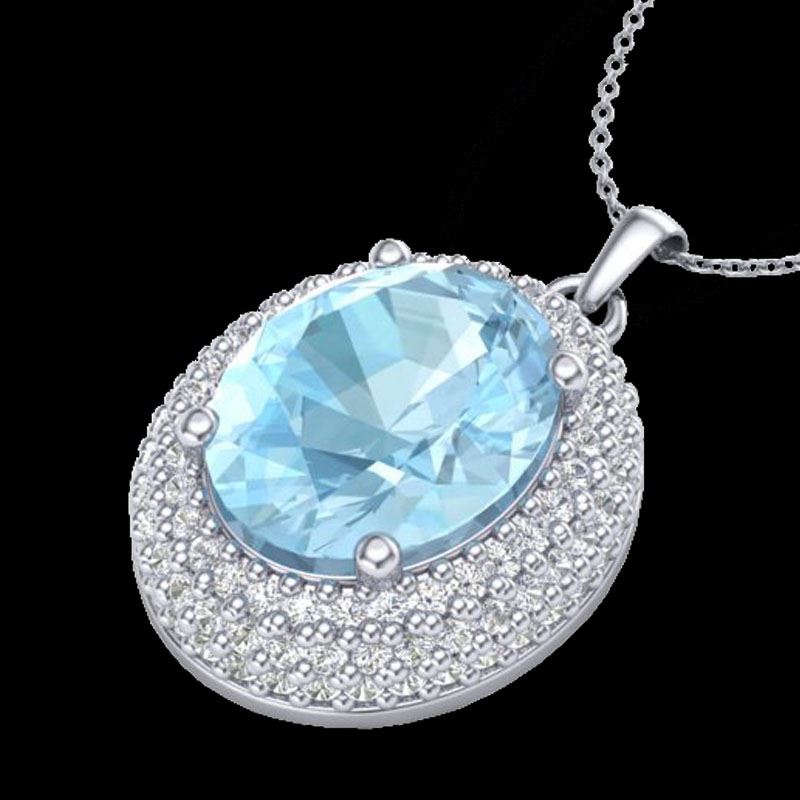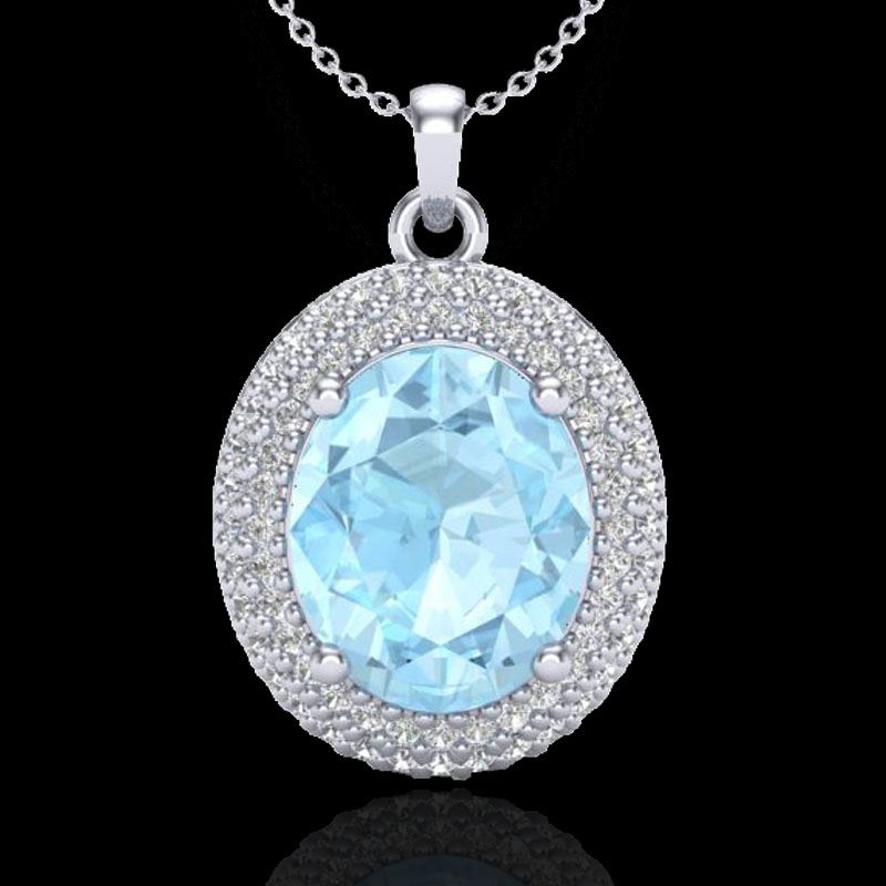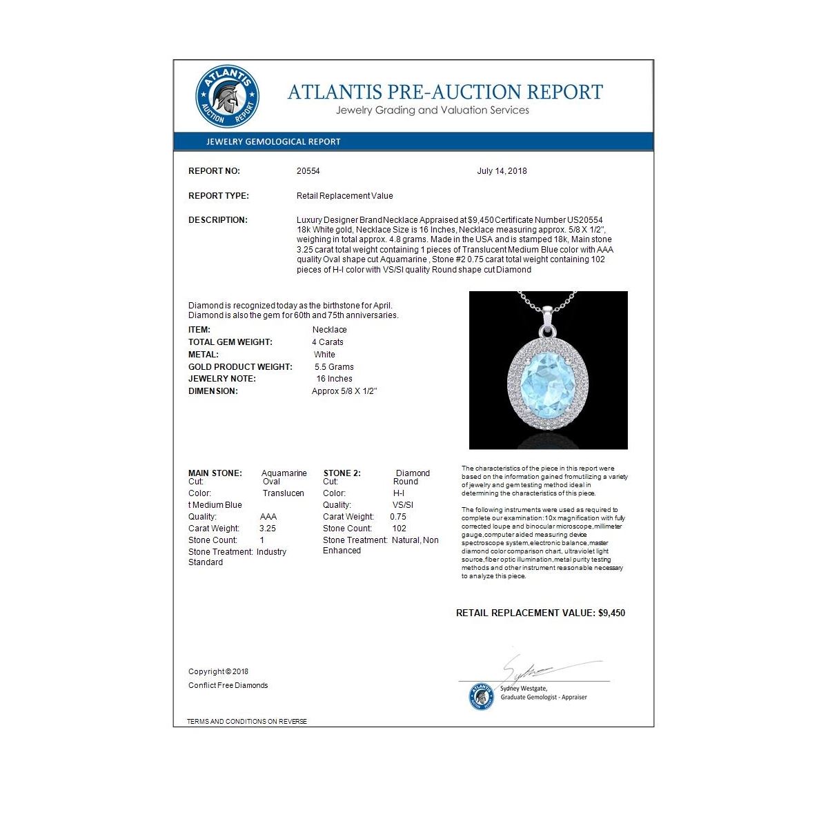 REF-122W8F -20554 ---- 4 CTW Aquamarine & Micro Pave VS/SI Diamond Necklace 18K White Gold ---- Luxury Designer Brand Necklace Appraised at $9,450 Certificate Number US20554 18k White gold, Necklace Size is 16 Inches, Necklace measuring approx. 5/8 X 1/2", weighing in total approx. 4.8 grams. Made in the USA and is stamped 18k, Main stone 3.25 carat total weight containing 1 pieces of Translucent Medium Blue color with AAA quality Oval shape cut Aquamarine , Stone #2 0.75 carat total weight containing 102 pieces of H-I color with VS/SI quality Round shape cut Diamond
