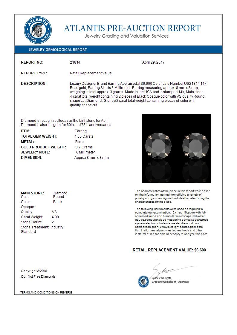 4 CTW Black VS/SI Diamond Designer Inspired Stud Earrings 14K Rose Gold ---- Luxury Designer Brand Earring Appraised Retail Price at $6,600 ---- SKU Number US21814 14k Rose gold Earring Size is 8 Millimeter, Earring measuring approx. 8 mm x 8 mm, weighing in total approx. 3 grams. Made in the USA and is stamped 14k, Main stone 4.00 carat total weight containing 2 pieces of Black Opaque color with VS quality Round shape cut Diamond , Stone #2 carat total weight containing pieces of color with quality shape cut