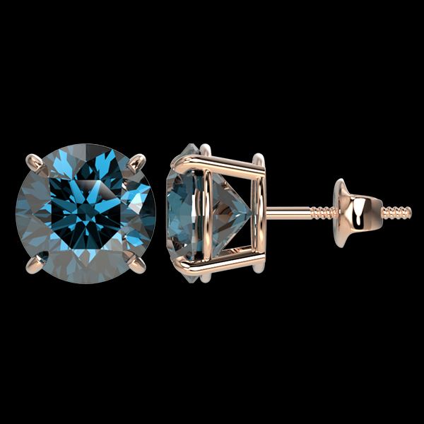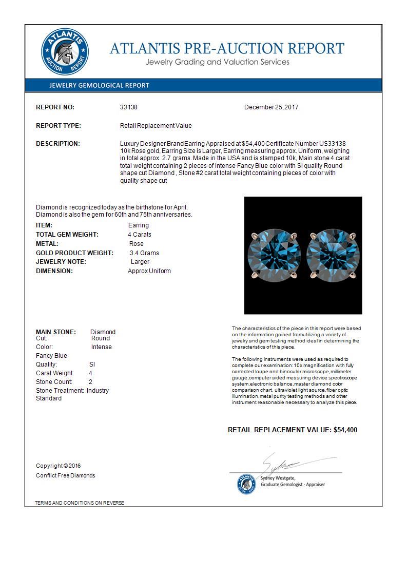REF-679M9H -33138 ---- 4 CTW Certified Intense Blue SI Diamond Solitaire Stud Earrings 10K Rose Gold ---- Luxury Designer Brand Earring Appraised at $54,400 Certificate Number US33138 10k Rose gold, Earring Size is Larger, Earring measuring approx. Uniform, weighing in total approx. 2.7 grams. Made in the USA and is stamped 10k, Main stone 4 carat total weight containing 2 pieces of Intense Fancy Blue color with SI quality Round shape cut Diamond , Stone #2 carat total weight containing pieces of color with quality shape cut