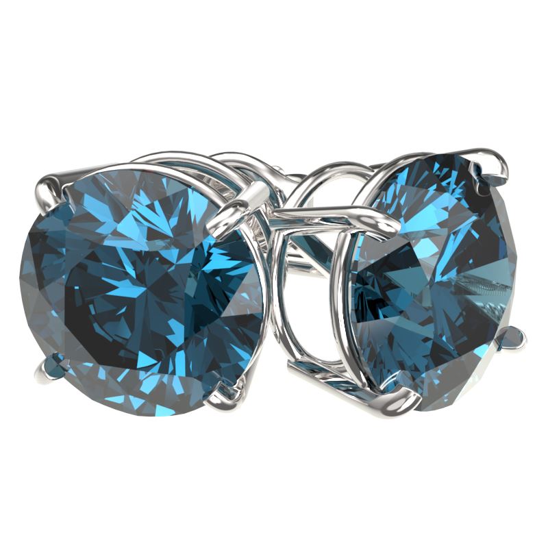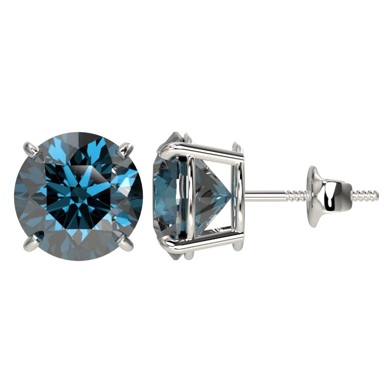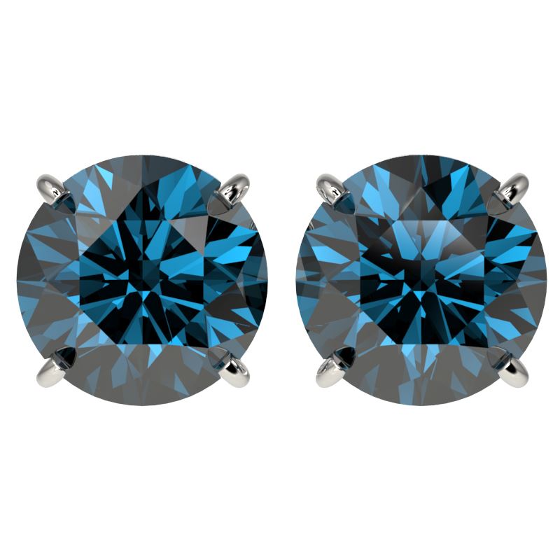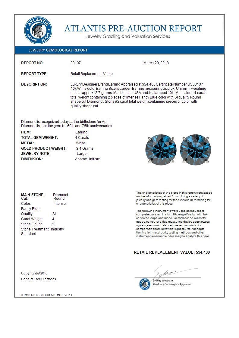 REF-679W9F -33137 ---- 4 CTW Certified Intense Blue SI Diamond Solitaire Stud Earrings 10K White Gold ---- Luxury Designer Brand Earring Appraised at $54,400 Certificate Number US33137 10k White gold, Earring Size is Larger, Earring measuring approx. Uniform, weighing in total approx. 2.7 grams. Made in the USA and is stamped 10k, Main stone 4 carat total weight containing 2 pieces of Intense Fancy Blue color with SI quality Round shape cut Diamond , Stone #2 carat total weight containing pieces of color with quality shape cut