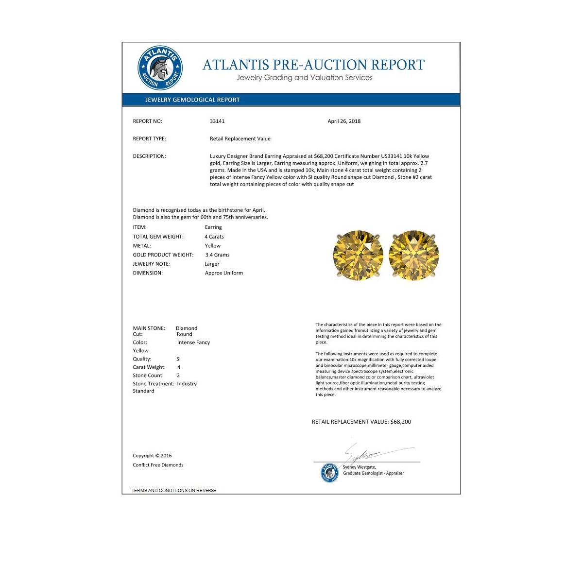 REF-930W2F -33141 ---- 4 CTW Certified Intense Yellow SI Diamond Solitaire Stud Earrings 10K Yellow Gold ---- Luxury Designer Brand Earring Appraised at $68,200 Certificate Number US33141 10k Yellow gold, Earring Size is Larger, Earring measuring approx. Uniform, weighing in total approx. 2.7 grams. Made in the USA and is stamped 10k, Main stone 4 carat total weight containing 2 pieces of Intense Fancy Yellow color with SI quality Round shape cut Diamond , Stone #2 carat total weight containing pieces of color with quality shape cut
