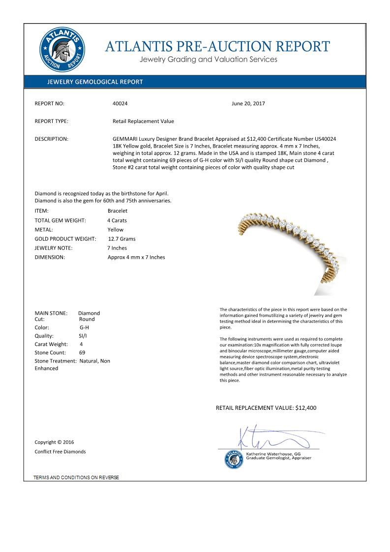 4 CTW Certified SI/I Diamond 2 Prong Bracelet 18K Yellow Gold ---- Luxury Designer Brand Bracelet Appraised Retail Price at $12,400  ---- SKU Number US40024 18K Yellow gold Bracelet Size is 7 Inches, Bracelet measuring approx. 4 mm x 7 Inches, weighing in total approx. 12 grams. Made in the USA and is stamped 18K, Main stone 4 carat total weight containing 69 pieces of G-H color with SI/I quality Round shape cut Diamond , Stone #2 carat total weight containing pieces of color with quality shape cut