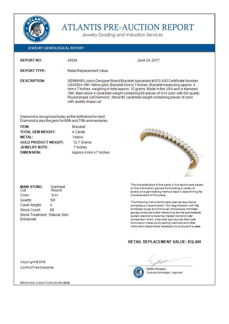 4 CTW Certified SI/I Diamond 2 Prong Bracelet 18K Yellow Gold ---- Luxury Designer Brand Bracelet Appraised Retail Price at $12,400 ---- SKU Number US40024 18K Yellow gold Bracelet Size is 7 Inches, Bracelet measuring approx. 4 mm x 7 Inches, weighing in total approx. 12 grams. Made in the USA and is stamped 18K, Main stone 4 carat total weight containing 69 pieces of G-H color with SI/I quality Round shape cut Diamond , Stone #2 carat total weight containing pieces of color with quality shape cut