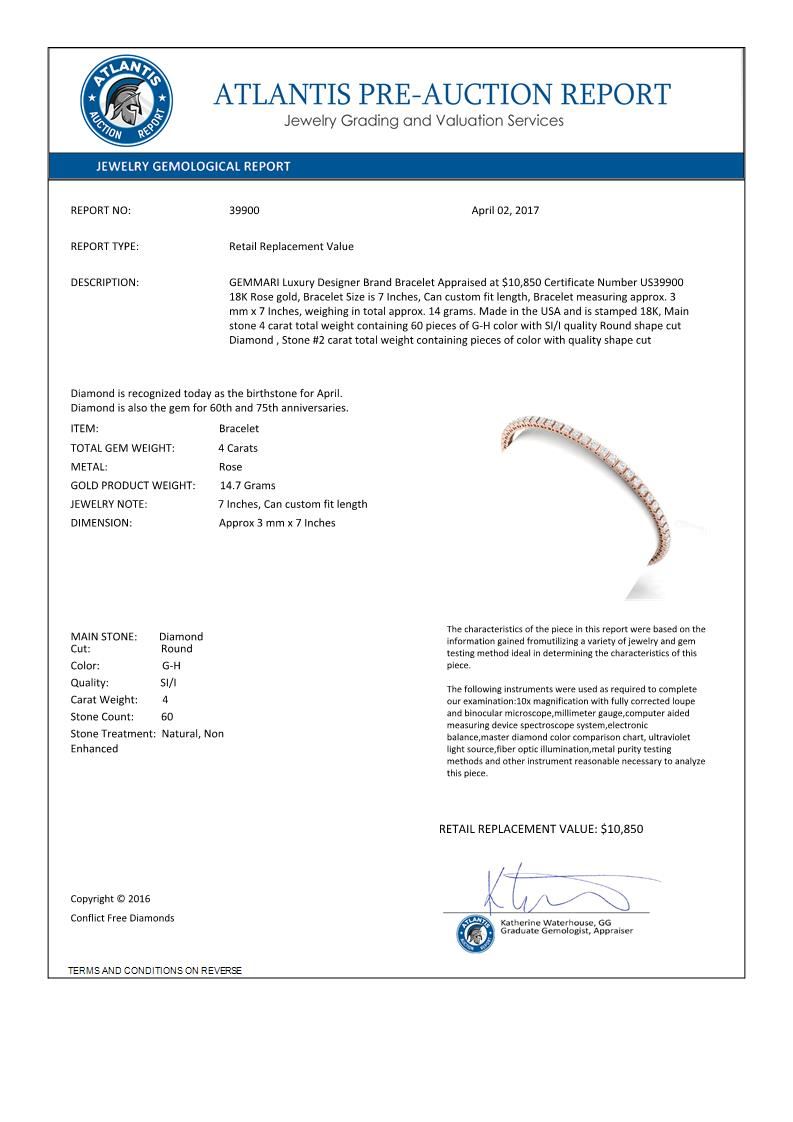 4 CTW Certified SI/I Diamond Bracelet 18K Rose Gold ---- Luxury Designer Brand Bracelet Appraised Retail Price at $10,850 ---- SKU Number US39900 18K Rose gold Bracelet Size is 7 Inches, Can custom fit length, Bracelet measuring approx. 3 mm x 7 Inches, weighing in total approx. 14 grams. Made in the USA and is stamped 18K, Main stone 4 carat total weight containing 60 pieces of G-H color with SI/I quality Round shape cut Diamond , Stone #2 carat total weight containing pieces of color with quality shape cut